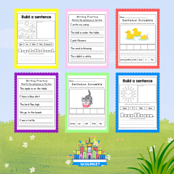 Barnet får läsa en enkel mening och skriva den ett ord i taget i separata rutor. Därefter skrivs hela meningen ut sammanhängande. Denna övning tränar ordigenkänning, skrivförmåga och förståelse för enkel meningsstruktur.