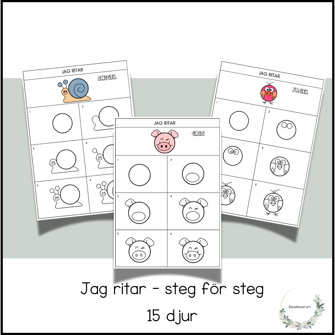 Steg för steg instruktioner för hur man kan rita 15 olika djur.