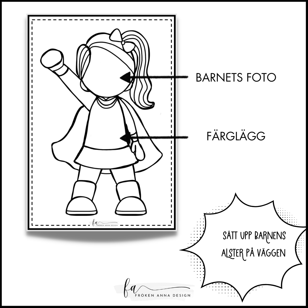 Vem vill inte vara en superhjälte? Limma fast ett foto på barnets ansikte och låt de färglägga sig själva som superhjältar. Sätt upp alla alster på väggen för allmän beskådan 🙂
