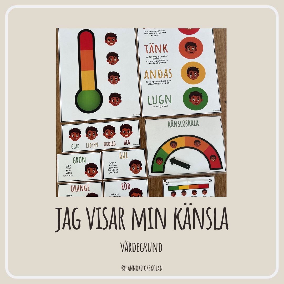 Jag visar min känsla – Ibland kan det vara svårt att sätta ord på sina känslor. Med hjälp av dessa arbetsblad kan barnen peka och beskriva hur det känns i kroppen. Den lilla skalan använder vi i en nyckelknippa som finns med oss hela tiden. Korten med beskrivning till varje färg fungerar som ett stöd för dig som pedagog.