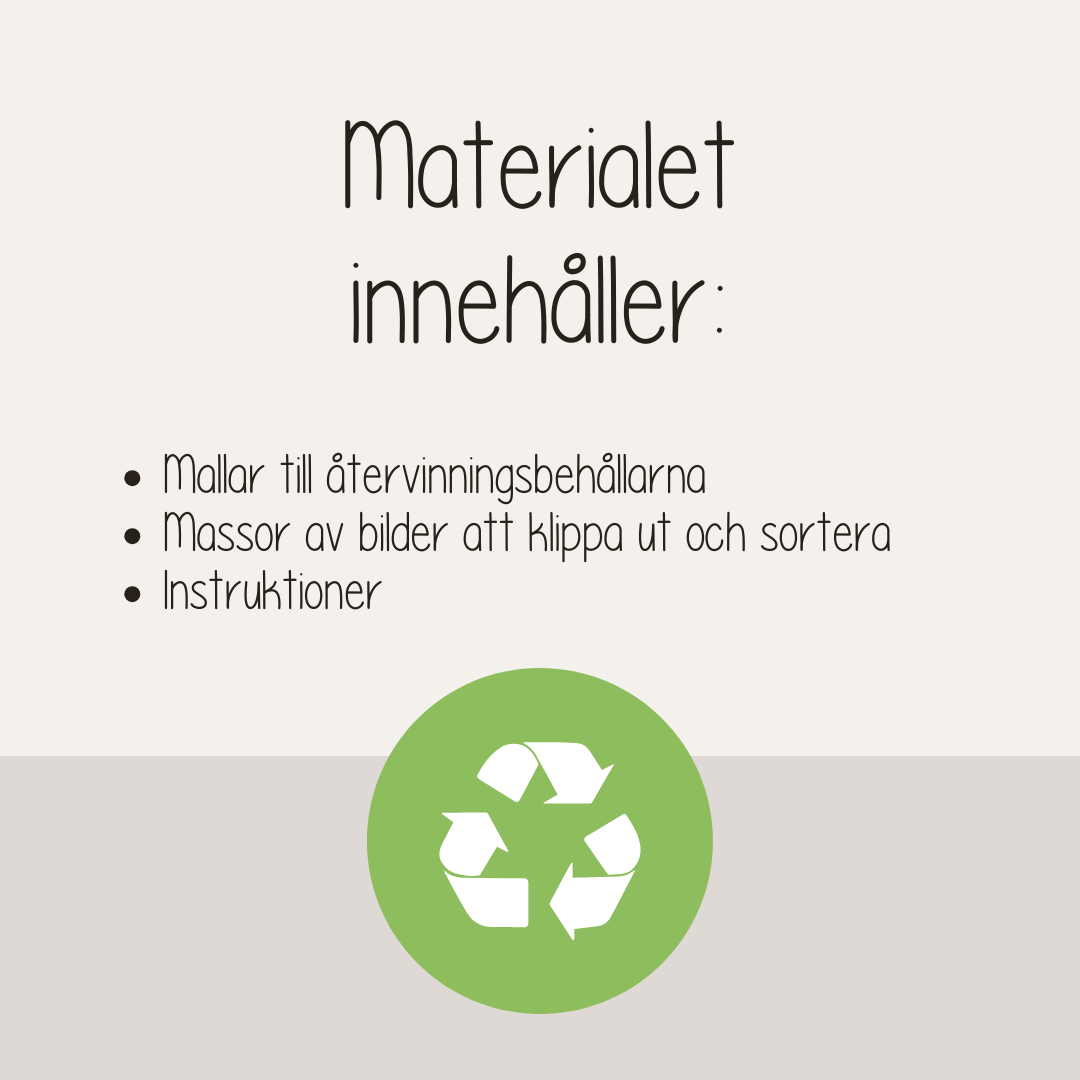 Gör din egen återvinningsstation. Skriv ut, klipp och klistra ihop återvinningsbehållarna och sortera sedan bilderna i rätt återvinning.