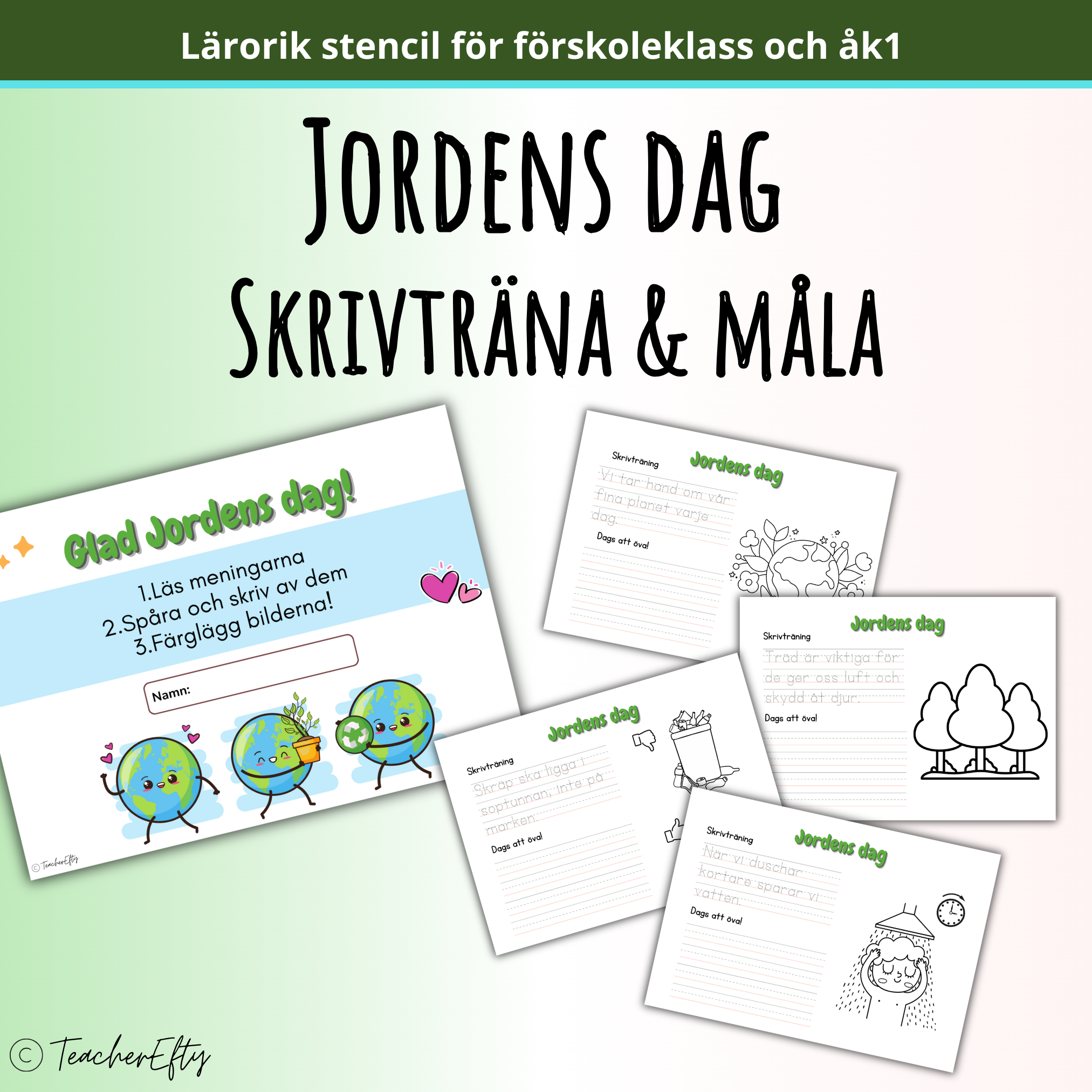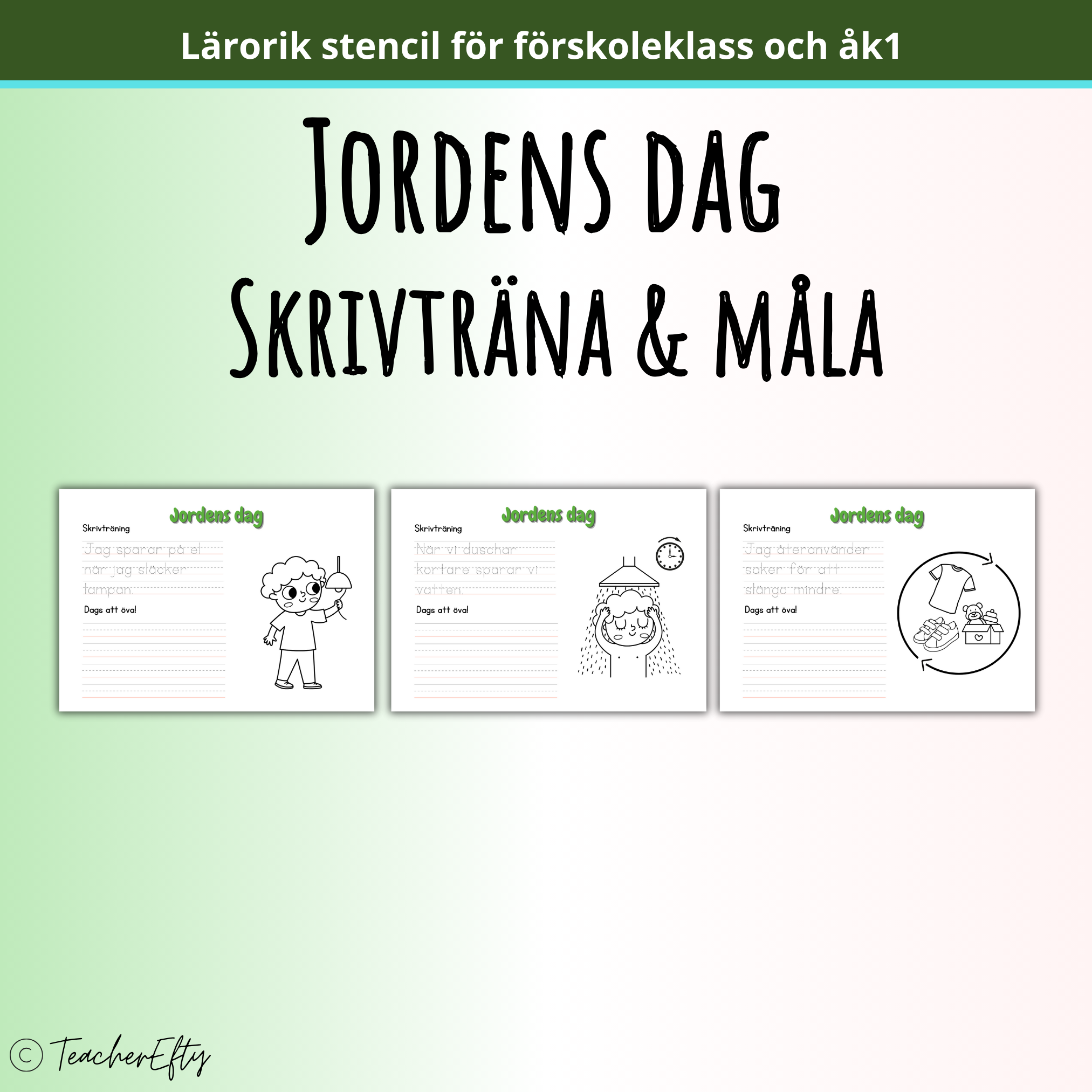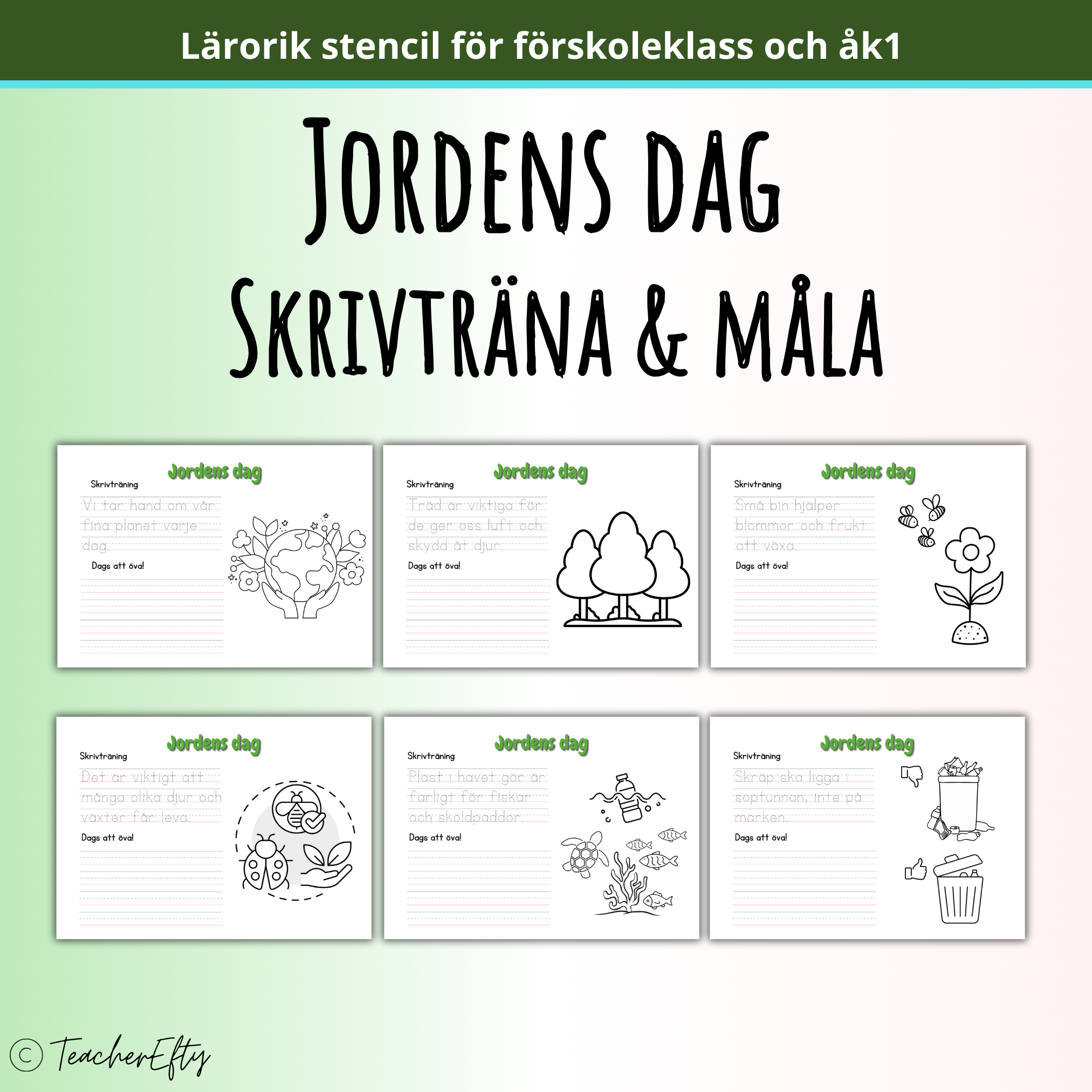 I detta material tränar eleverna på att skriva enkla meningar genom att spåra och skriva av text och färglägga bilder med miljötema.