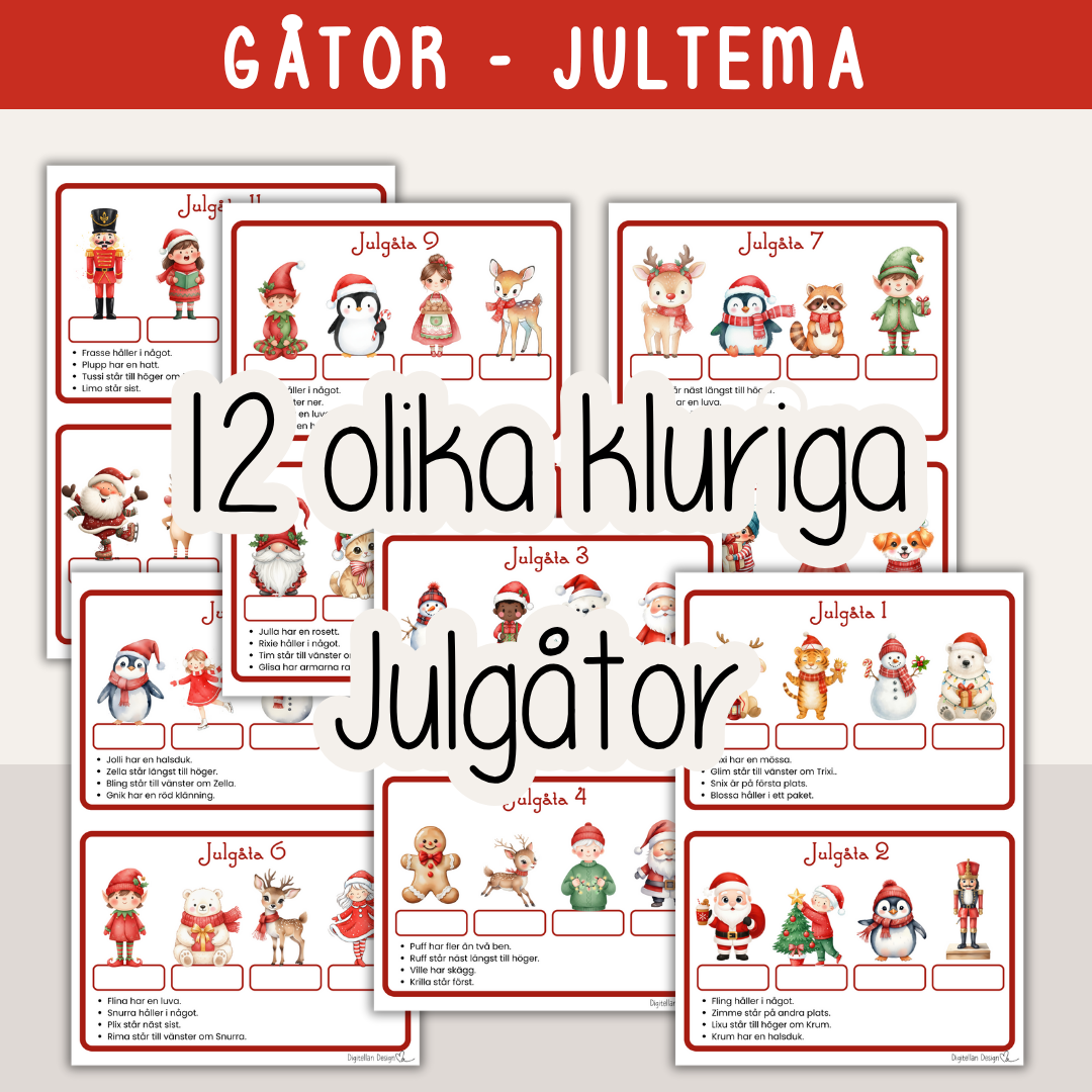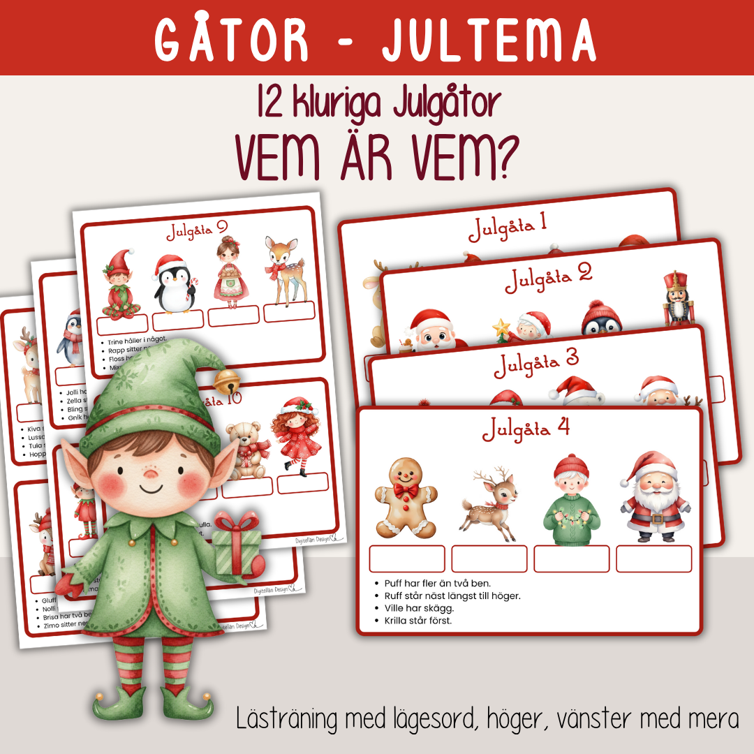 12 olika kort med julgåtor, klura ut vem som är vem av julfigurerna på bilderna. Träna på lägesord som först, sist, höger, vänster med mera.