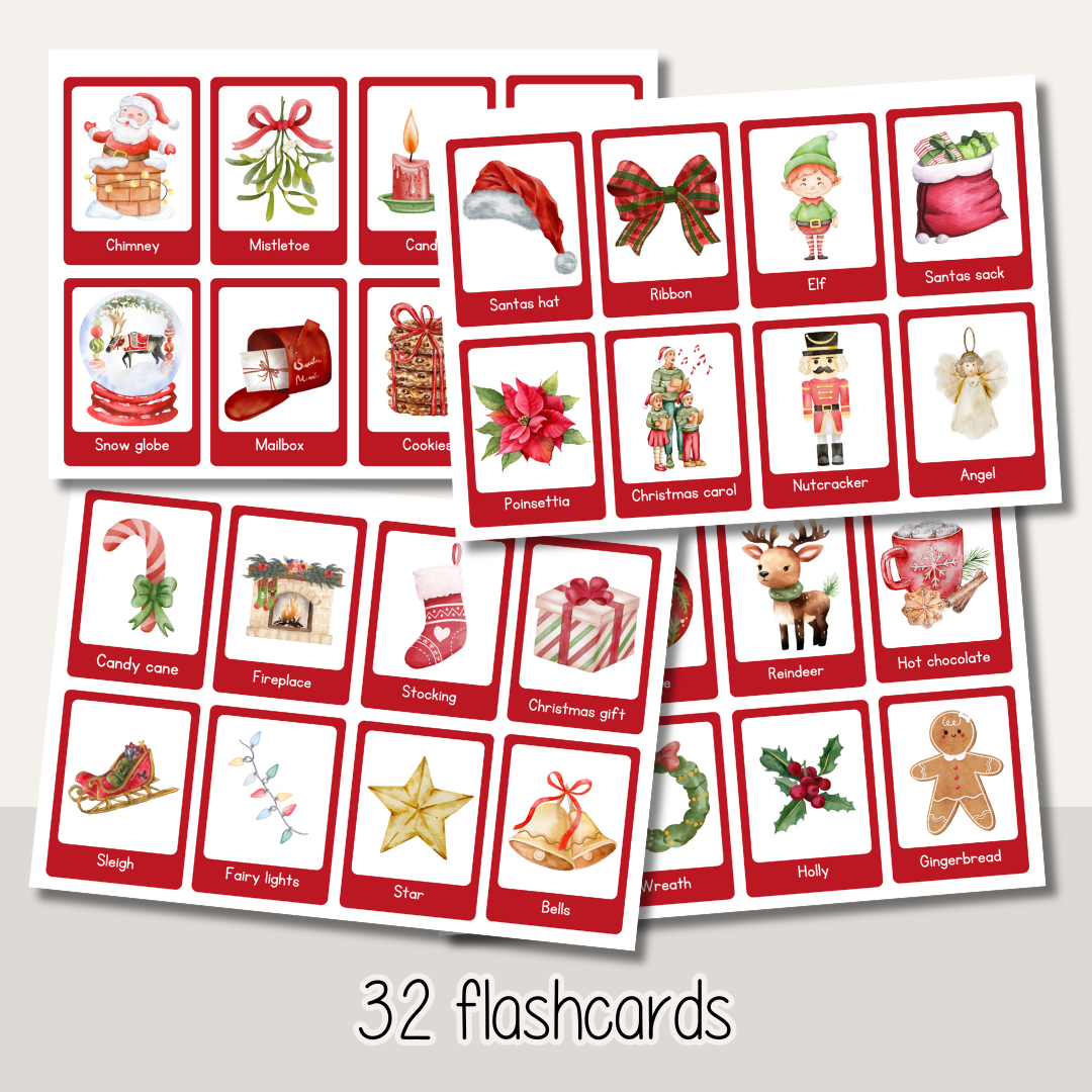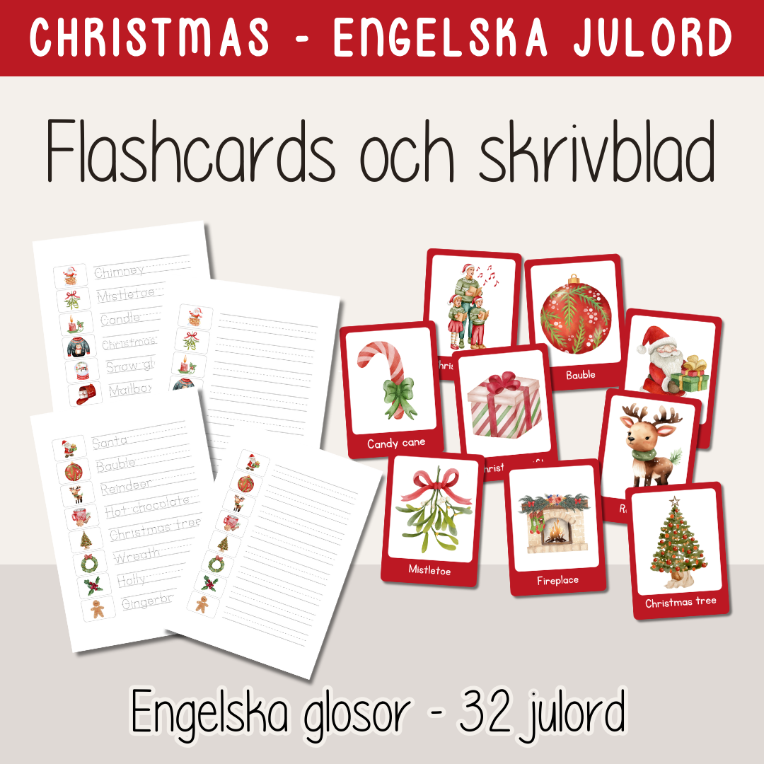 Ett paket med 32 st ordkort och tillhörande skrivblad på engelska. Klipp ut korten och laminera för att använda om och om igen. Skrivbladen som hör till kommer i två olika varianter, med och utan hjälpord. Ett paket för att träna engelska ordförståelse nu i juletid. Perfekt att använda som glosor.