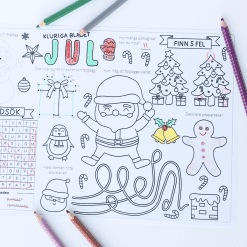 Klurigt blad med tema jul. Rita, räkna, färglägg, finn fem fel, punkt till punkt, ordsök med mera.