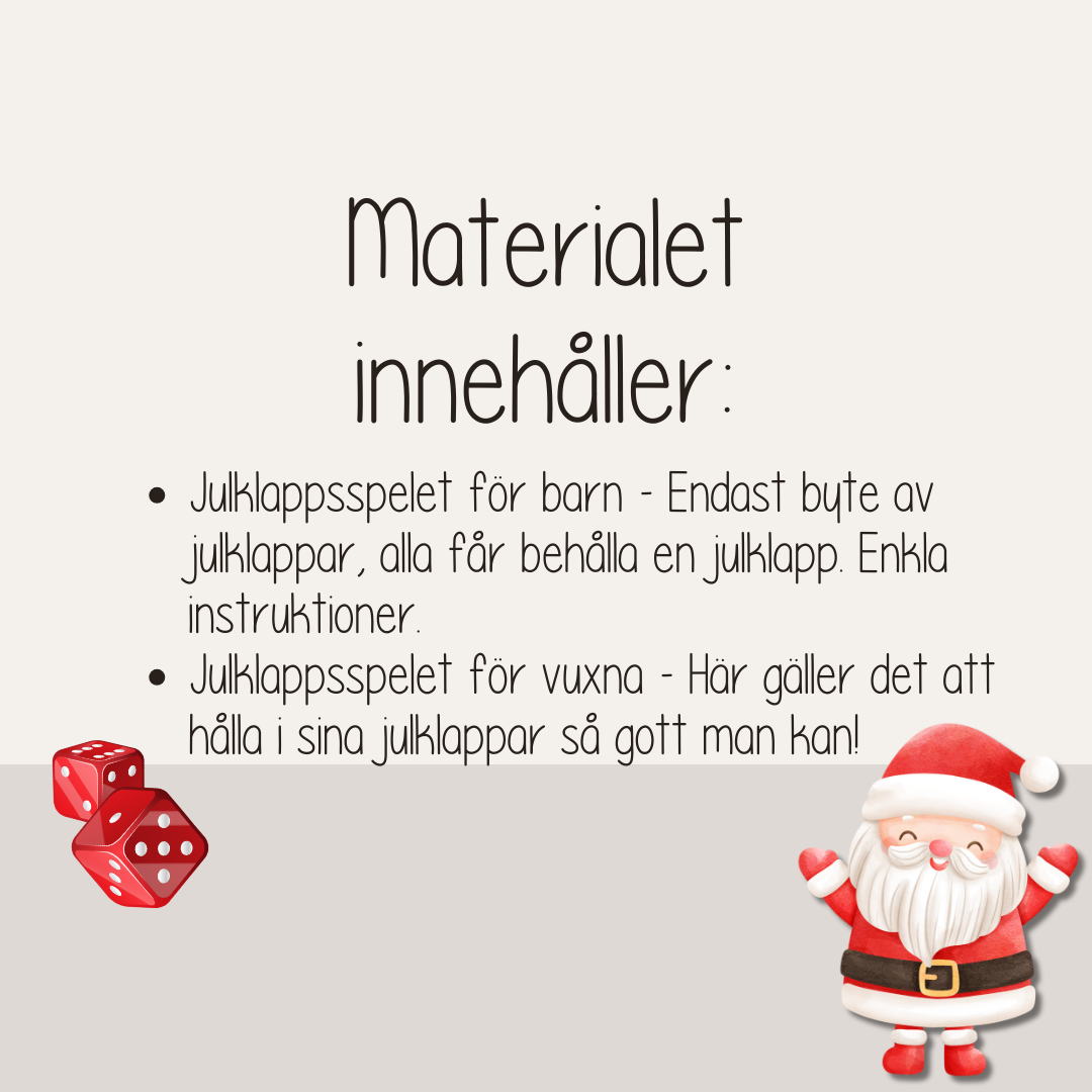 - Julklappsspelet för barn – Endast byte av julklappar, alla får behålla en julklapp. Enkla instruktioner.