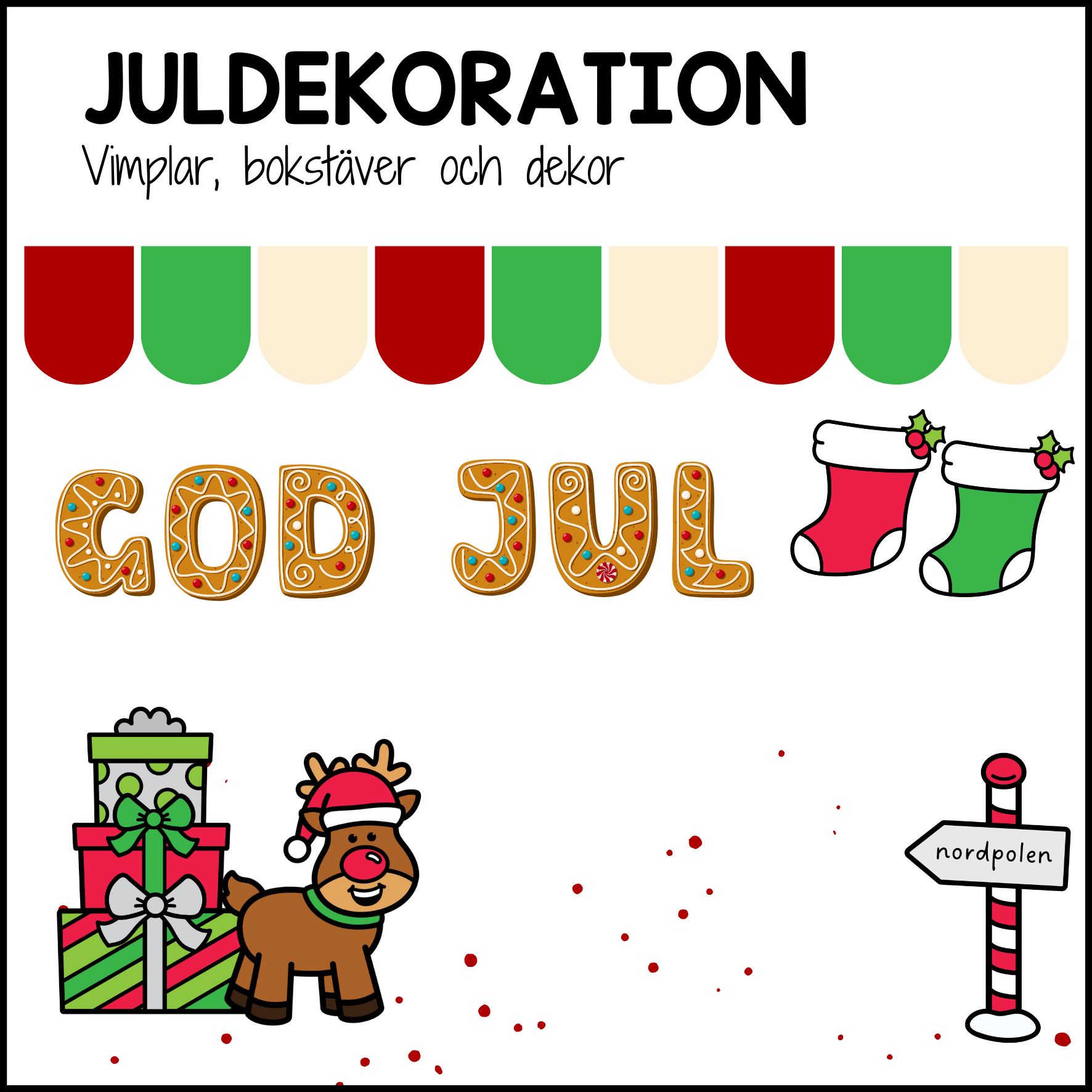 Juldekoration: tre olika varianter på ”GOD JUL”, vimplar, tre olika julklappar, skylt till nordpolen, ren, stjärna, julgranskulor, julkrans, julstrumpor.