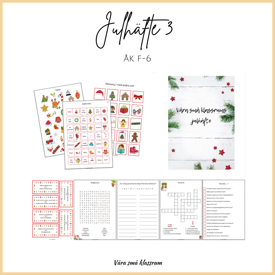 Ett häfte fyllt med material för att skapa en rolig undervisning med temat jul i klassrummet eller trivsam stund tillsammans med familjen.