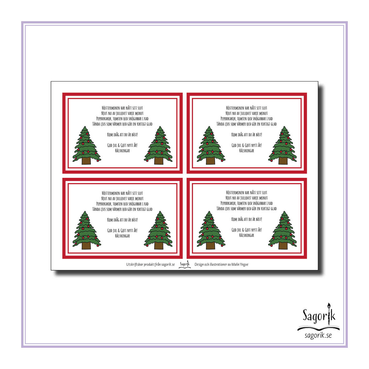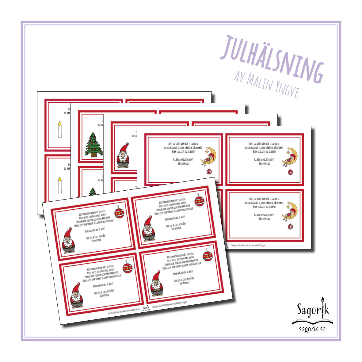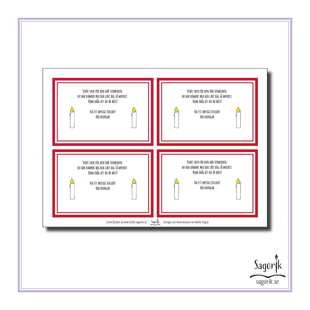 Hälsningar med julmotiv att ge eleverna på julavslutningen innan de går på jullov. Längst ner finns plats för lärarens namn.