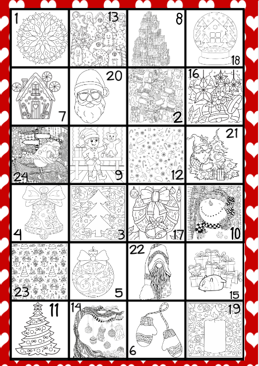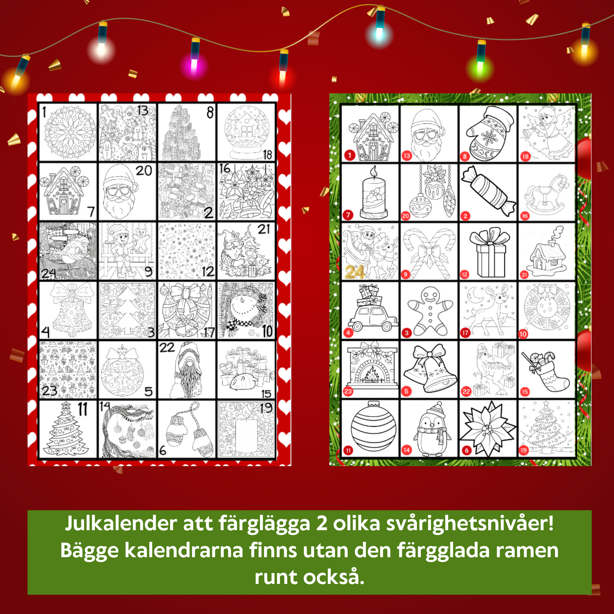 Färglägg en bild varje dag! I det här paketet får du två olika kalendrar där en är mer avancerad och detaljerad. Bägge kalendrarna kommer i 2 olika versioner med eller utan en julig ram runt dvs utskriftsvänliga versioner. Medföljer två extra färgläggningsbilder.