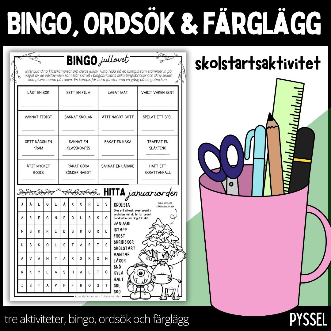 Jullovsbingo med 16 olika påståenden, samt en ordssöksruta och en bild att färglägga. En rolig uppgift att starta första skoldagen efter jullovet med.