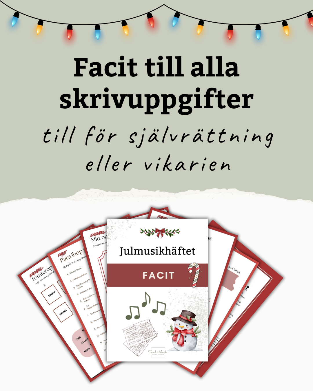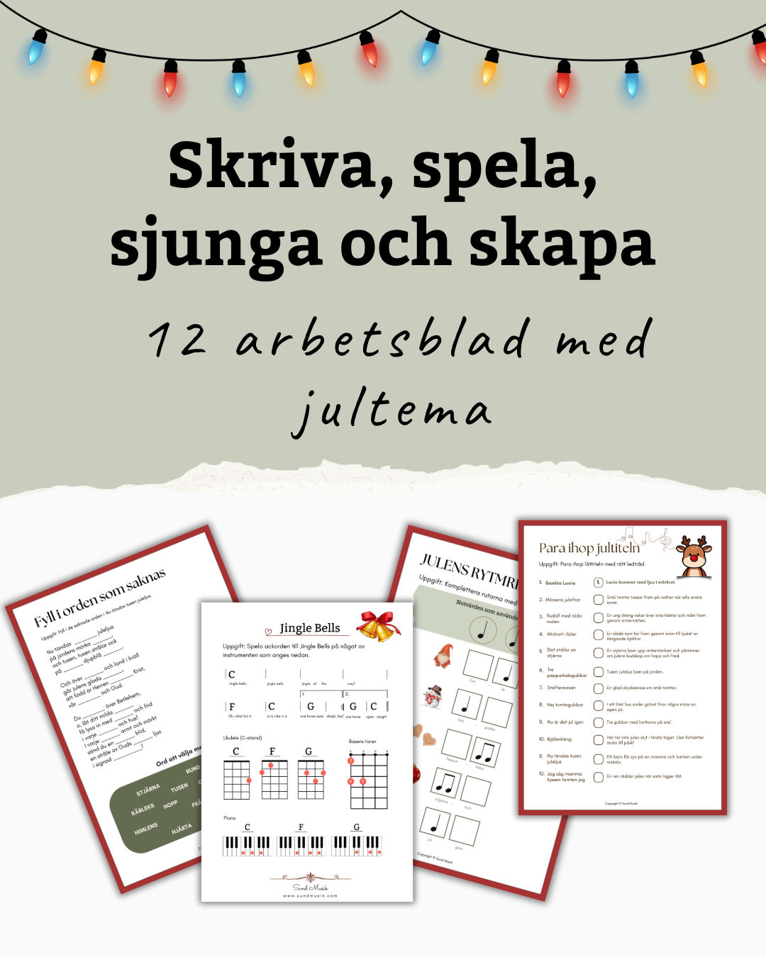 Här finns lucktexter, “para ihop julsången”, rytmrebusar, melodi- och ackordspel samt en uppgift där eleverna får skapa sin egen julrap.