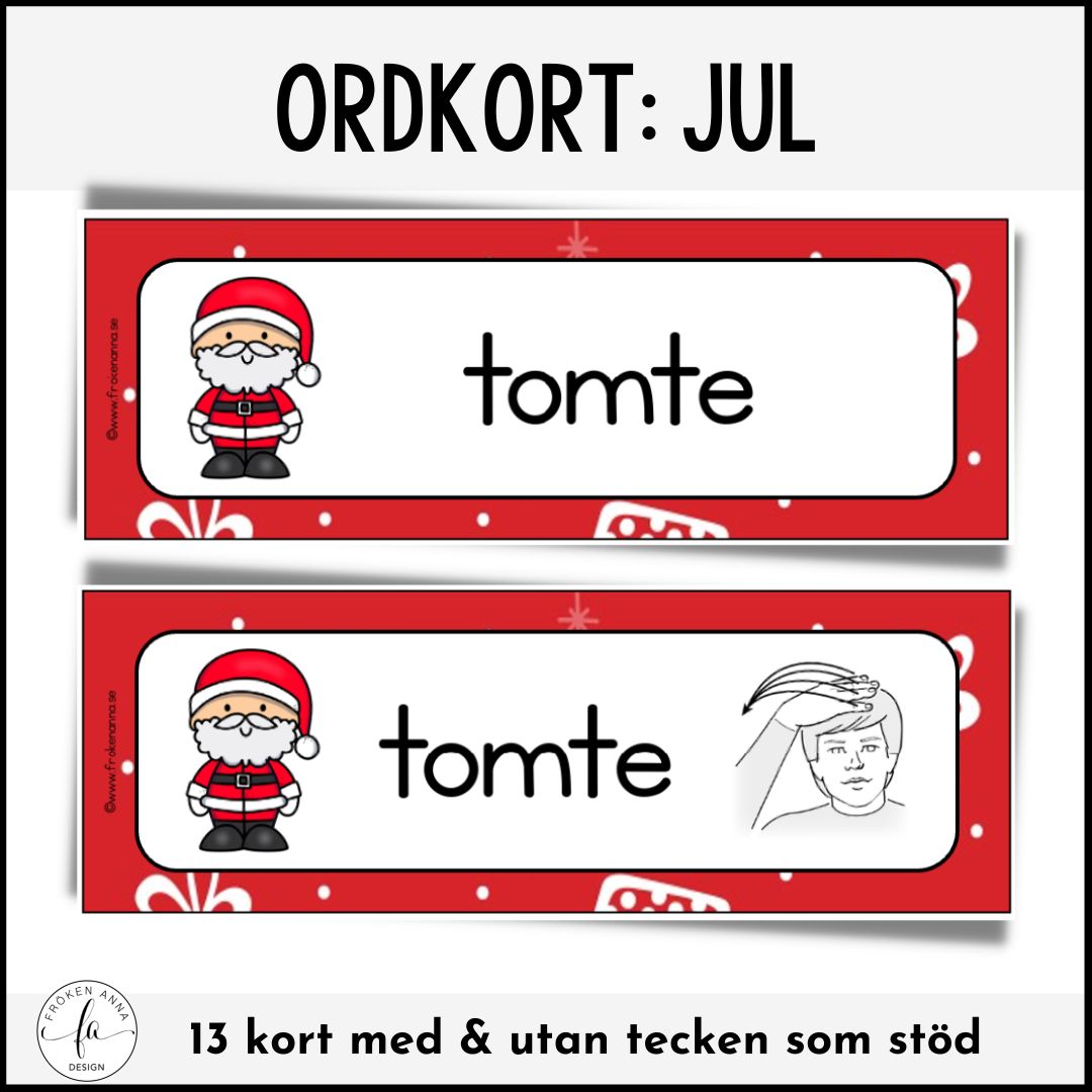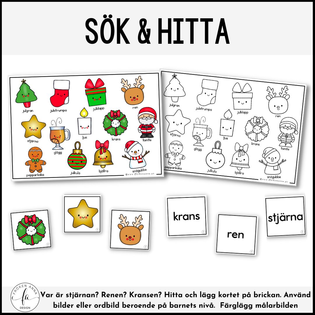 - Sök och hitta: Hitta julbilderna och lägg rätt bild på brickan. Använd bilderna för yngre barn och ordkorten för äldre.