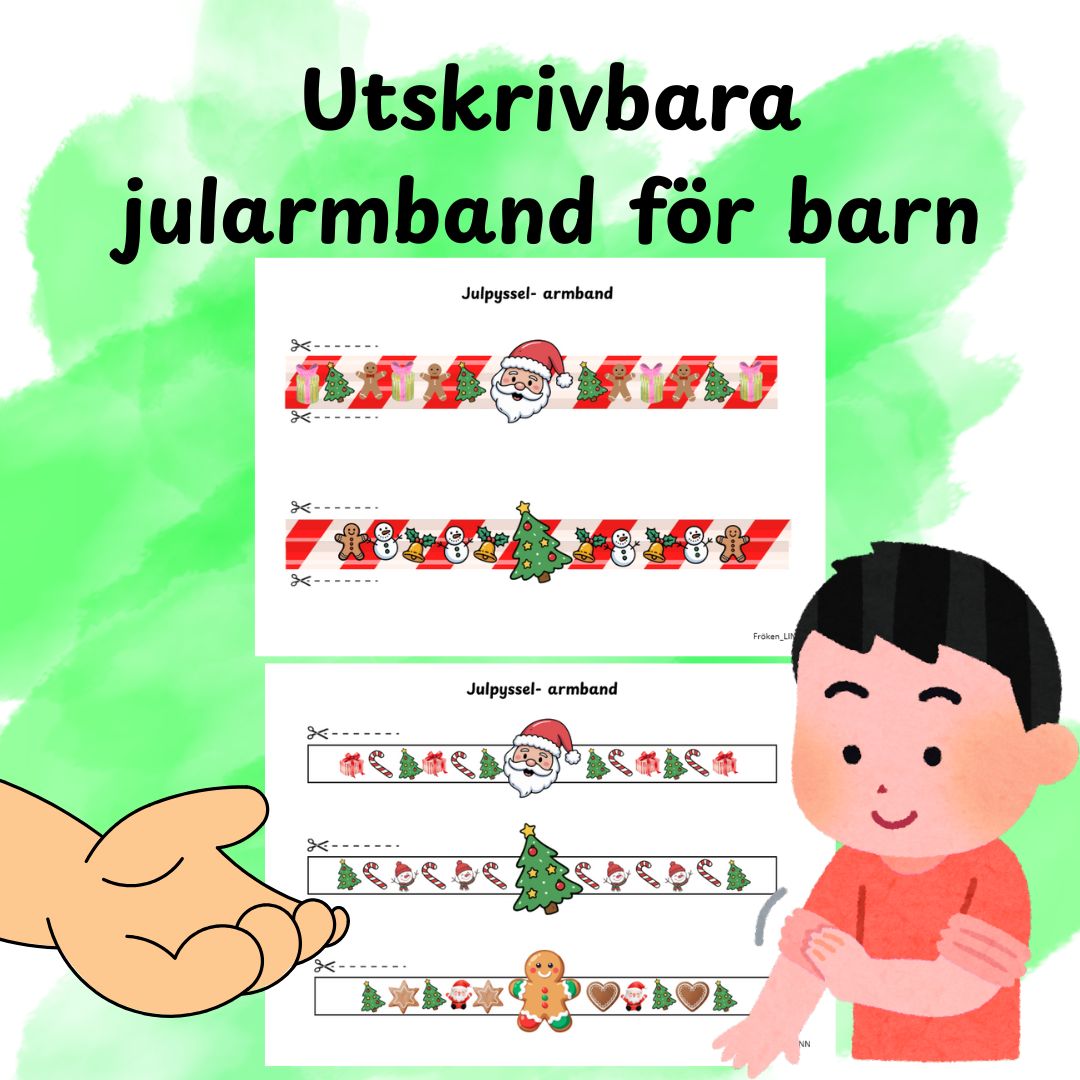 Gör julpysslet extra roligt med mina armband som kommer i fem olika julmotiv. Skriv ut PDF-filen, klipp ut och fäst ändarna så att armbandet passar. Storleken kan anpassas efter varje barn. Ett snabbt och charmigt pyssel som passar perfekt till klassens julfest eller en mysig stund i skolan.