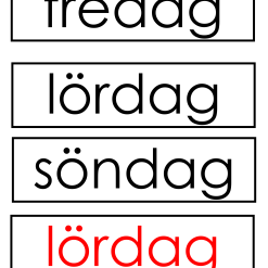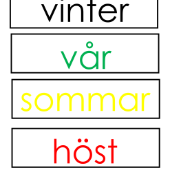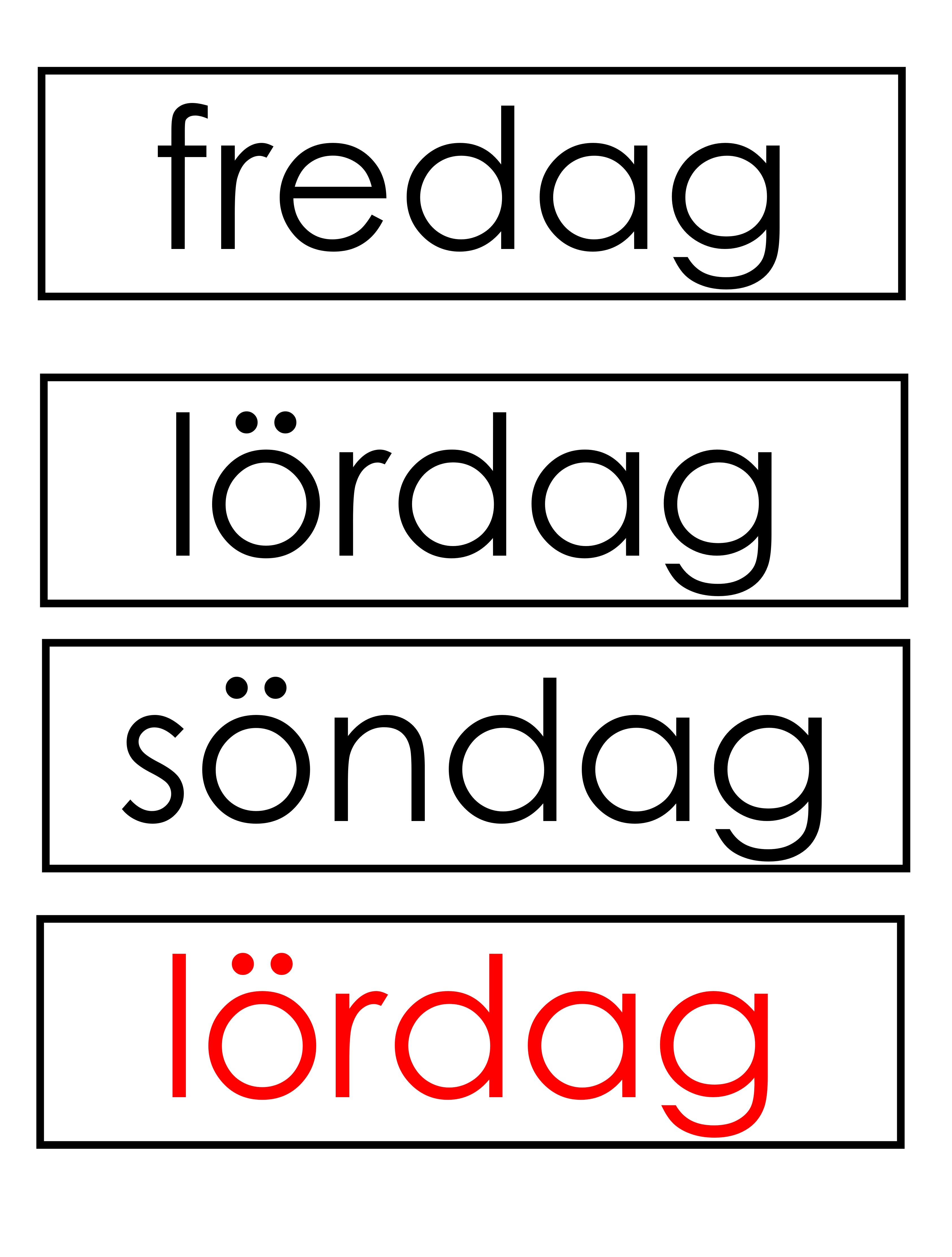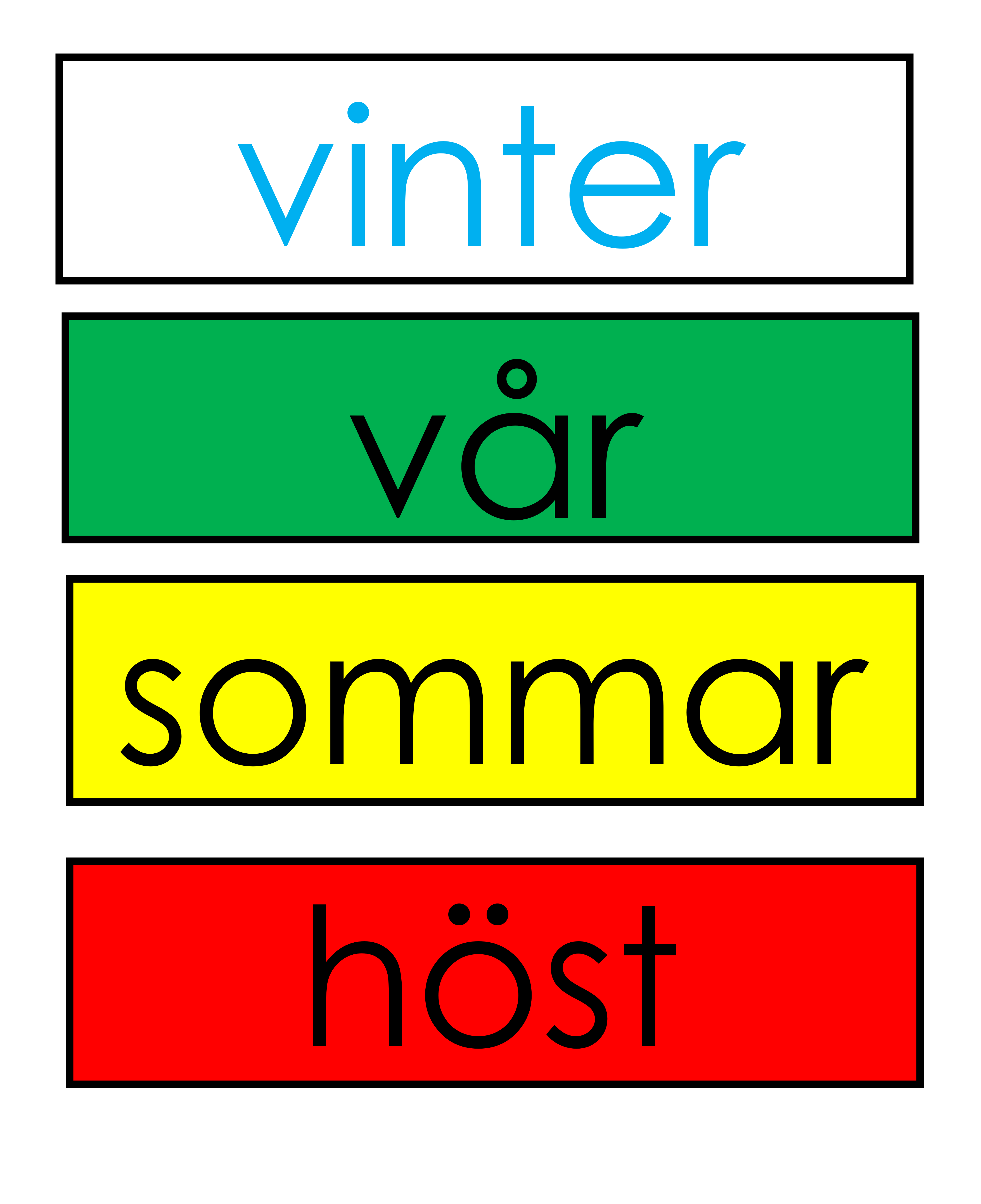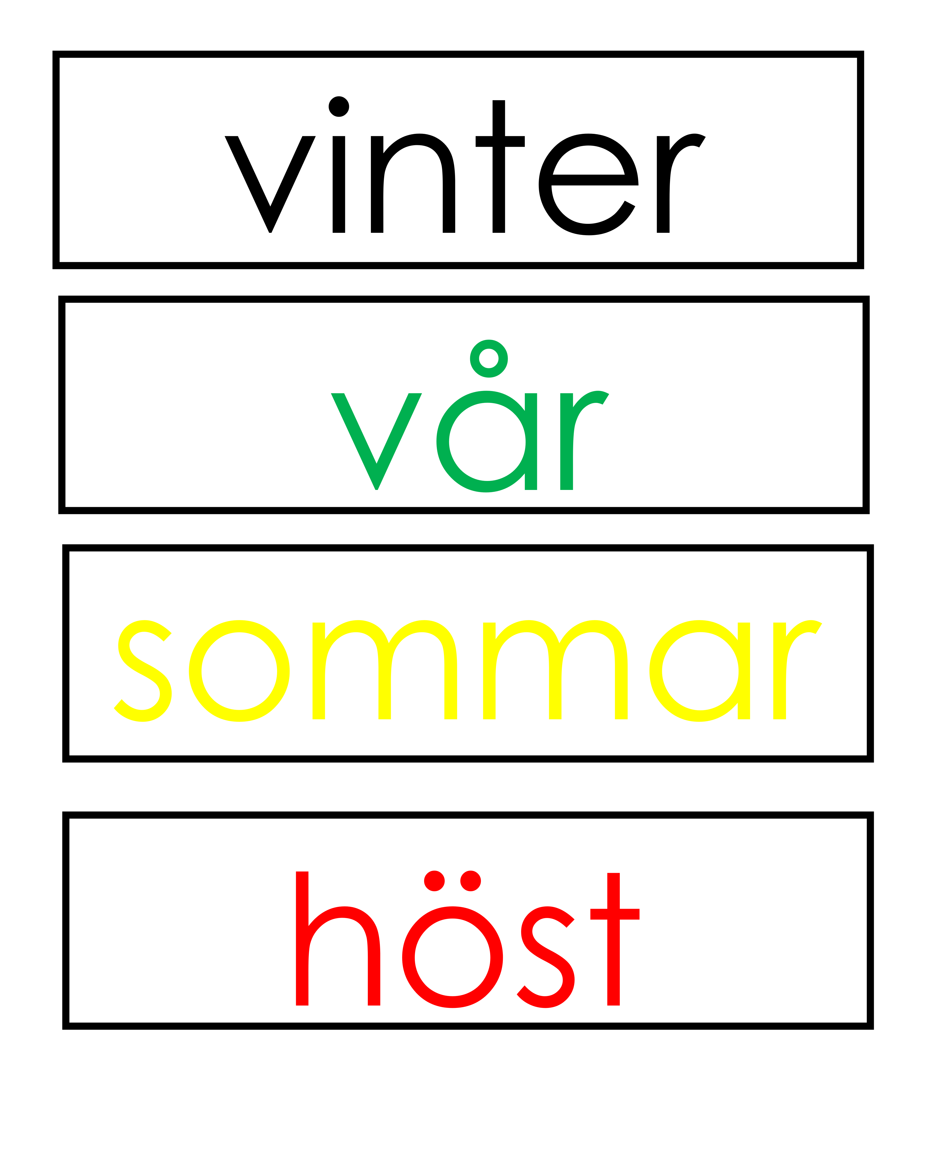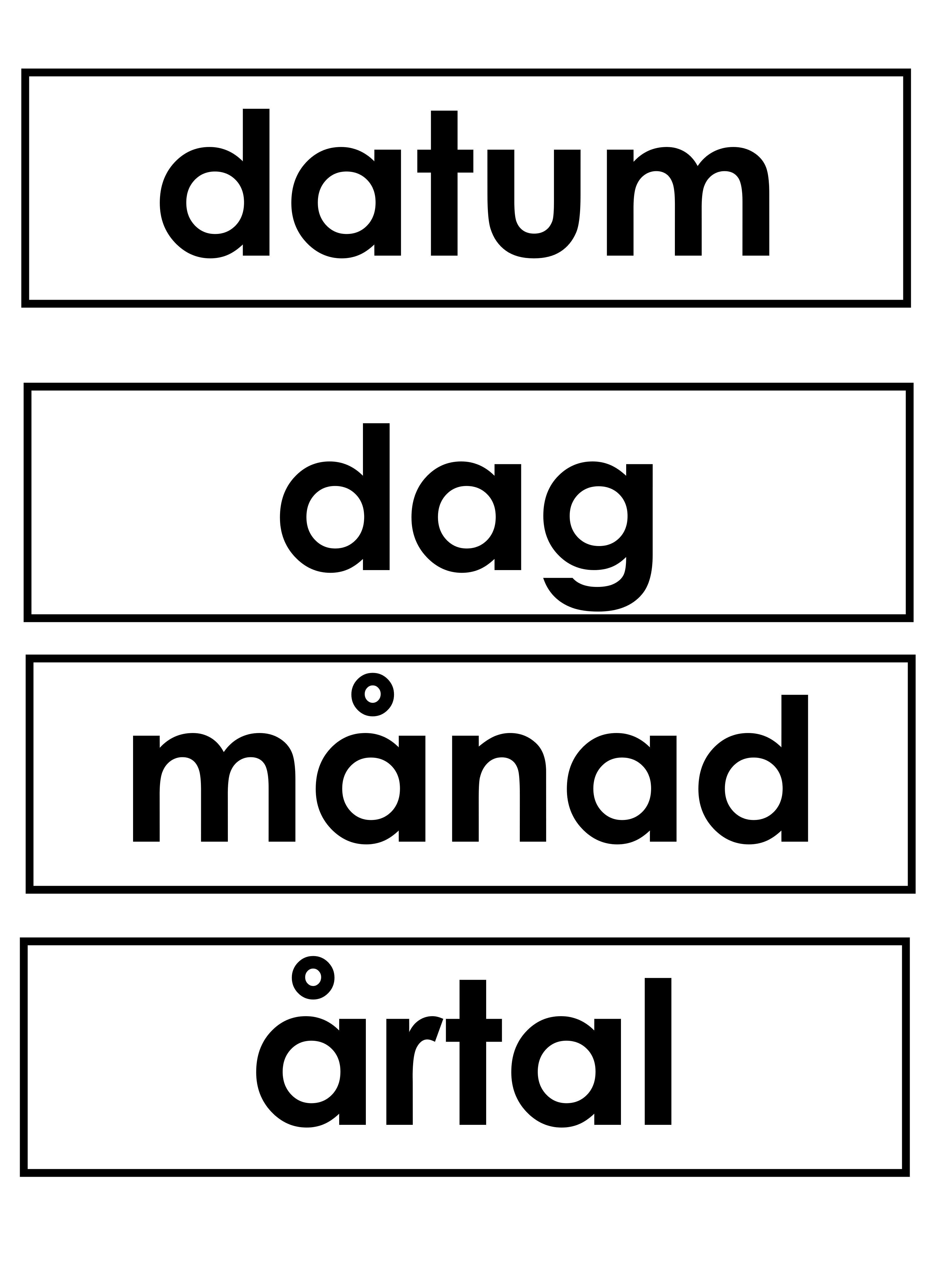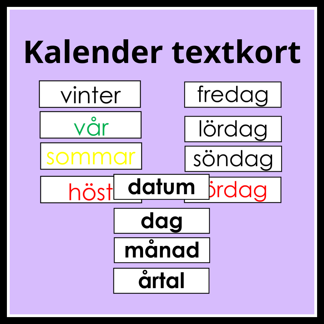 Materialet innehåller rubrikskort, veckodagar, månader, årstider och årtal. Några med färg och andra i svart vitt