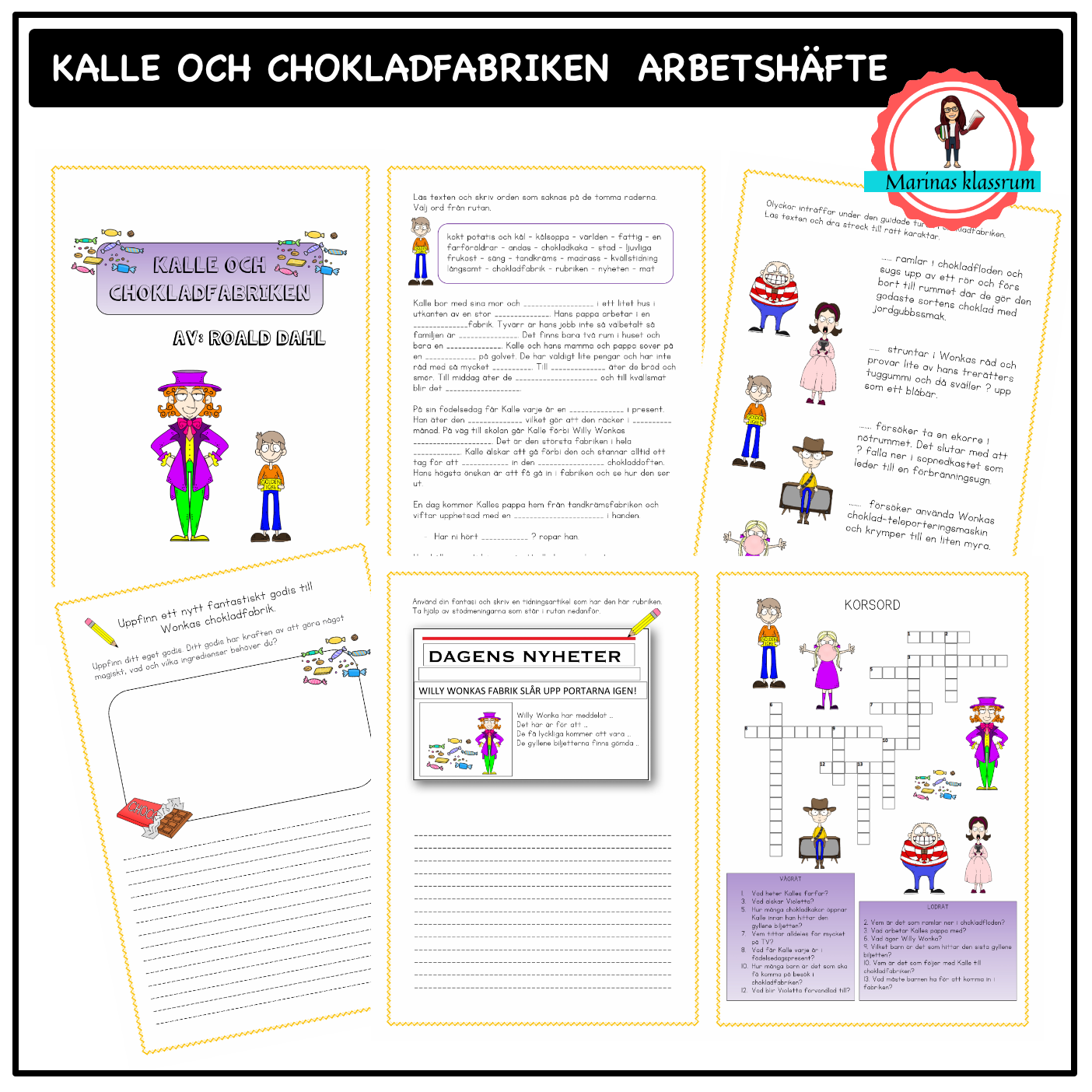 Ett arbetshäfte att arbeta med kring Roald Dals bok ”Kalle och chokladfabriken”. Häftet innehåller 31 sidor med många olika övningar för att fördjupa sig i bokens handling och dess karaktärer.