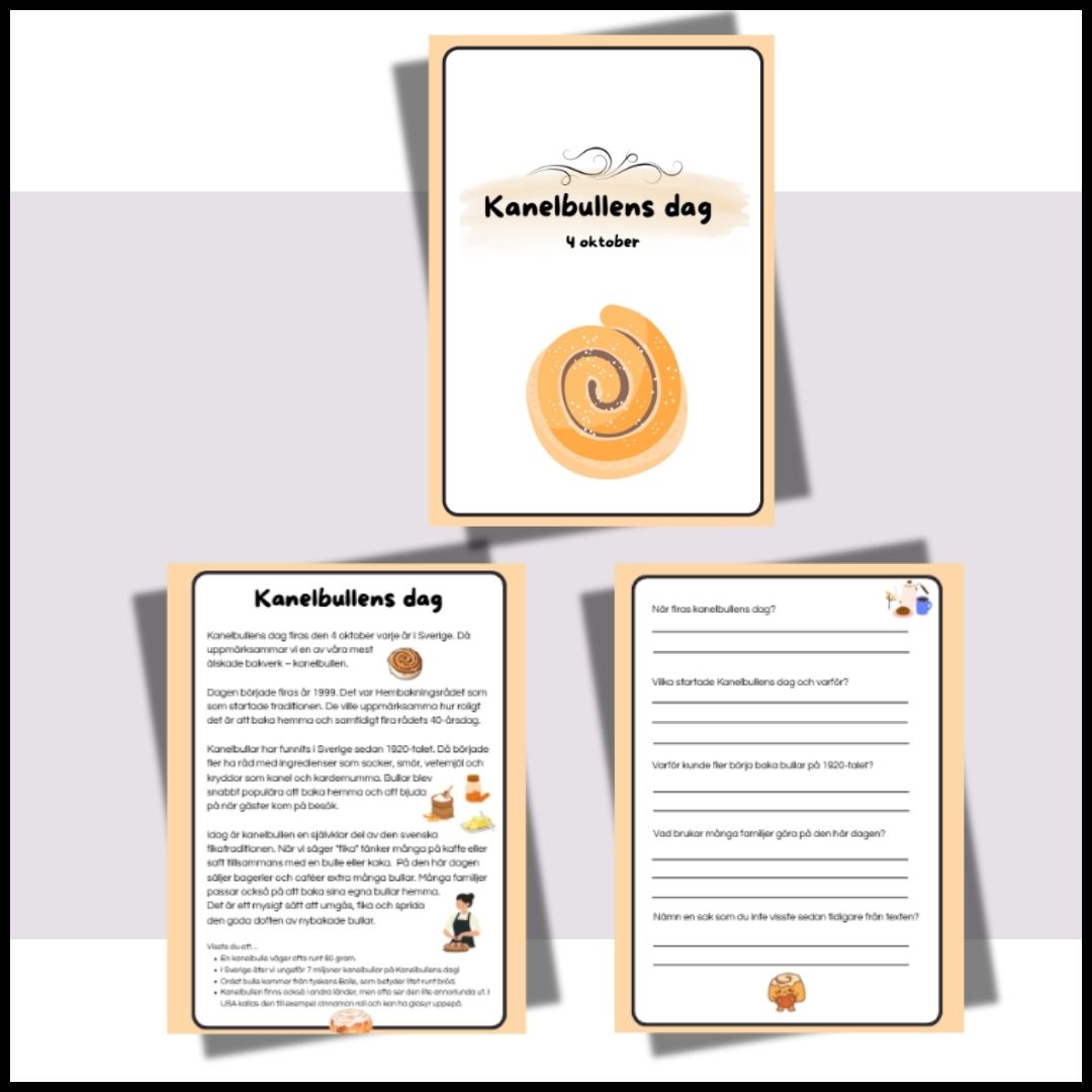 Faktatext/läsförståelse om Kanelbullens dag. Tillhörande läsförståelse frågor + möjlighet att skriva en faktatext.