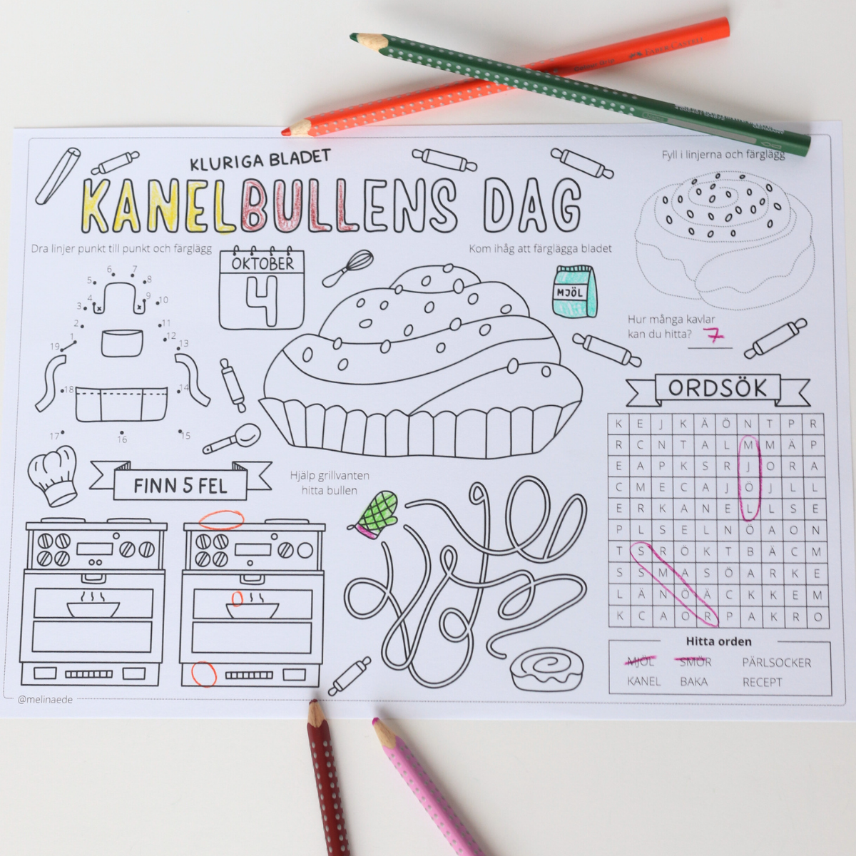Klurigt pysselblad med tema kanelbullens dag. Rita, räkna, färglägg, finn fem fel, punkt till punkt, ordsök med mera.