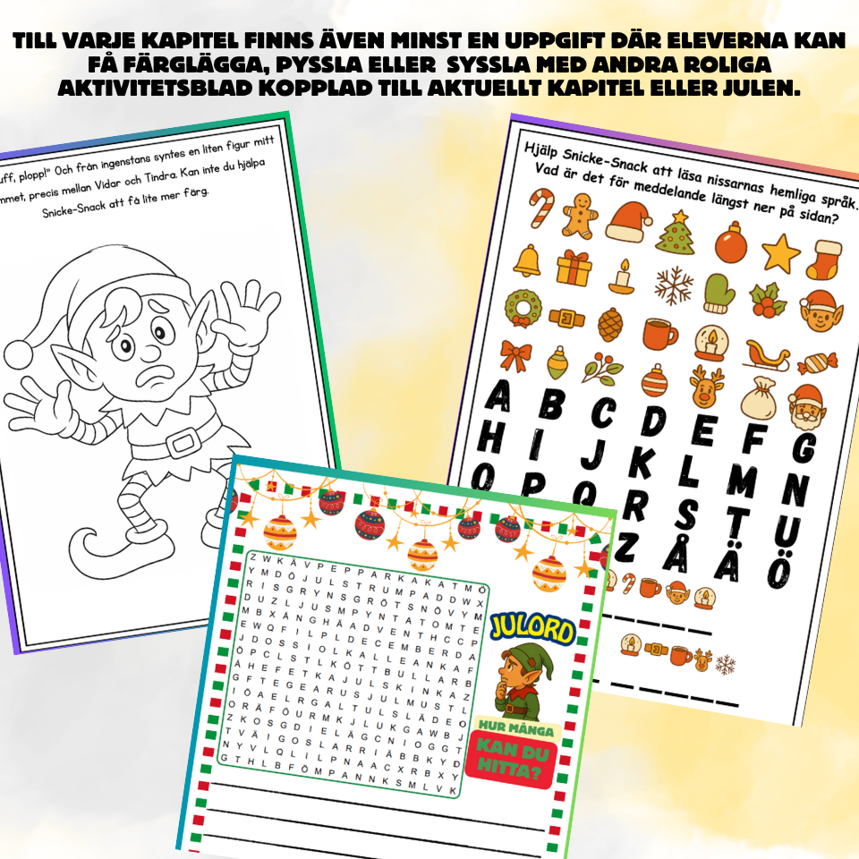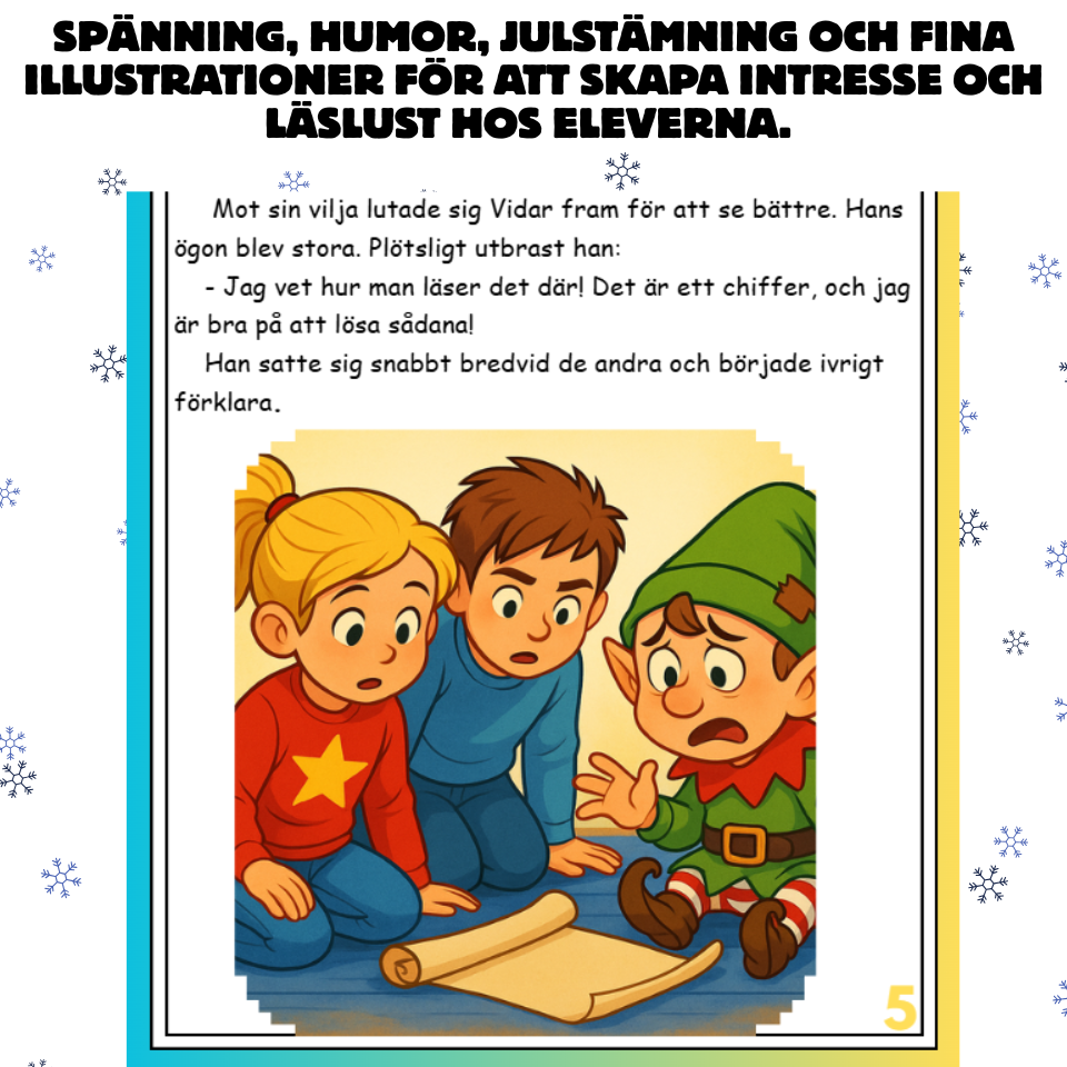 En bok full av julstämning, spänning och humor för att öka elevernas läslust. Boken kan läsas som en julkalenderbok med ett kapitel för varje skoldag fram till terminsavslutningen, sammanlagt 15 kapitel. Den kan användas till högläsning eller som ett eget arbetsmaterial för eleverna. Varje kapitel avslutas med läsförståelsefrågor på olika nivåer, övningar för att träna ord från kapitlet och olika aktivitetsblad med koppling till aktuellt kapitel eller till julen.