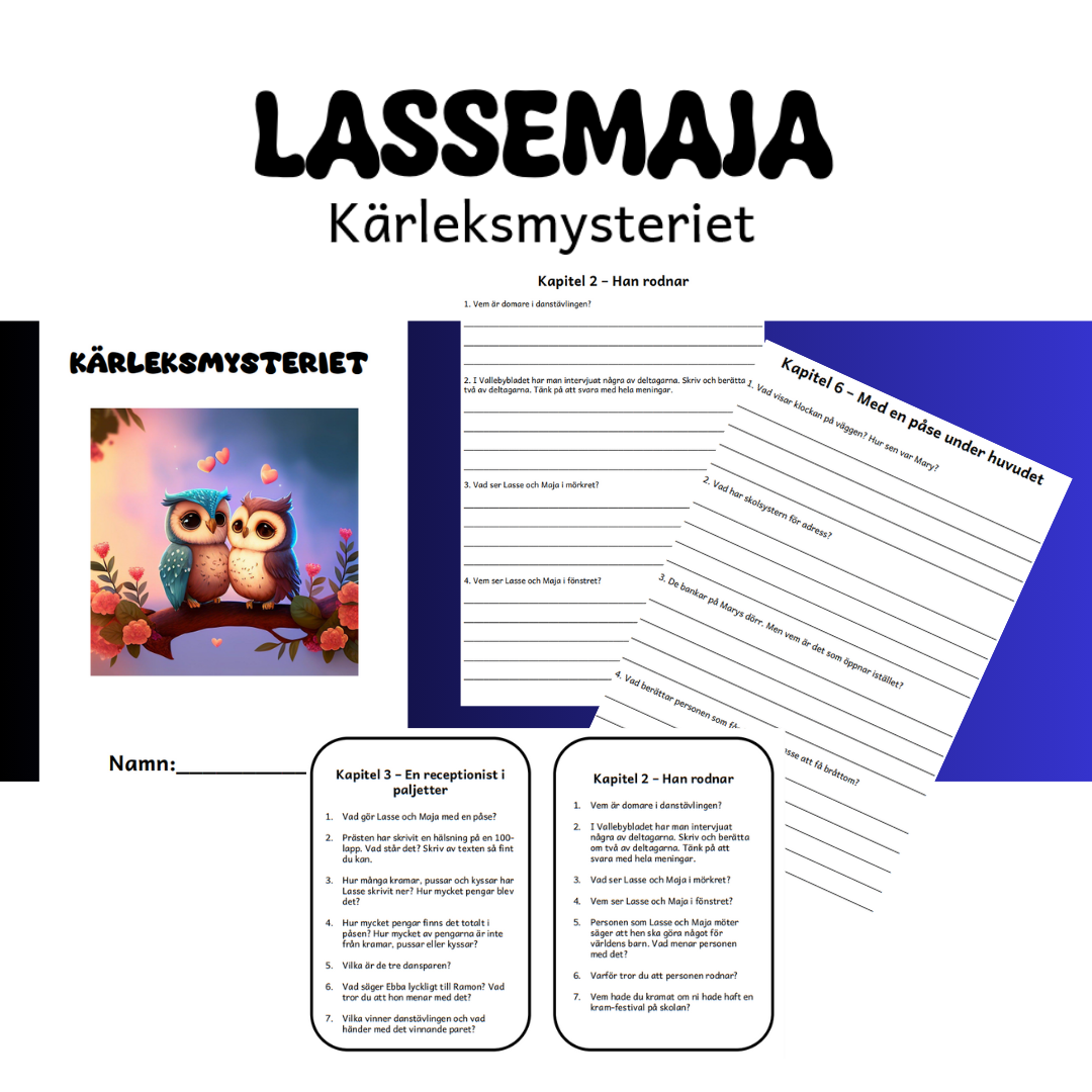 Läsförståelsefrågor till Kärleksmysteriet. I materialet finns det ett häfte med 7 frågor till varje kapitel. Använd materialet för enskild läsning, gruppläsning eller varför inte högläsning och diskutera frågorna i helklass. Det finns också möjlighet att skriva ut och laminera frågorna och sätta alla frågor till kapitlet med framsidan i en nyckelring.