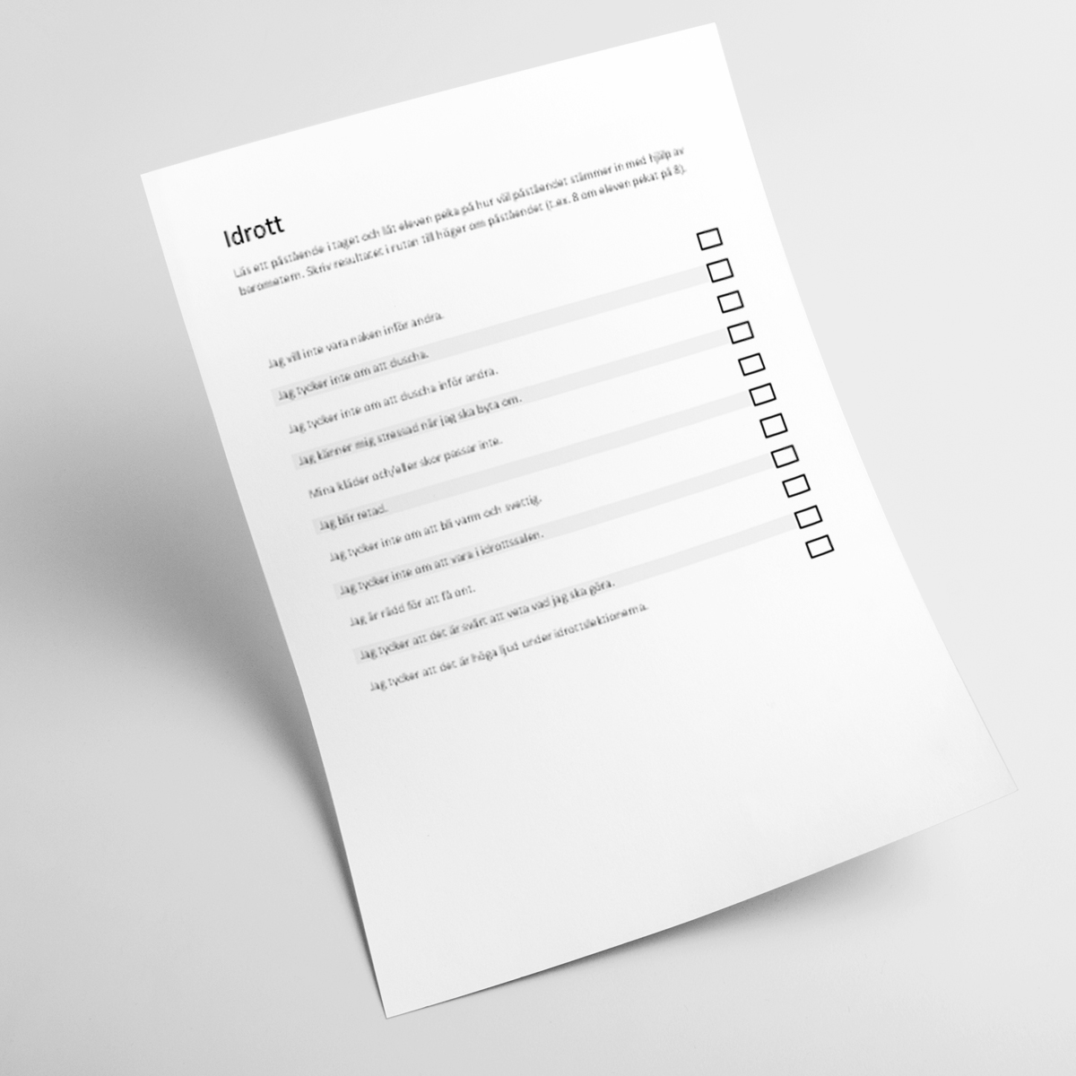 Kenth Hedevåg skriver i sin bok ”När mallen inte stämmer” om en metod för att ta reda på VARFÖR en elev känner oro inför ett moment. Detta dokument utgår från hans metod och är tänkt som stöd vid samtal med en enskild elev. Om exempelvis en elev inte vill delta i idrottsundervisningen kan du ta fram dokumentet för idrott, ändra, lägga till eller ta bort innehåll som du tror kan vara orsaken till elevens oro. Skriv sedan ut dokumentet och en barometer som du också hittar i min butik kostnadsfritt. Sedan läser du ett påstående i taget och låter eleven peka på barometern för hur väl påståendet stämmer eller ej. Resultatet dokumenterar du i dokumentet. När ni förhoppningsvis har kunnat kartlägga vilken del av momentet eleven känner oro inför kan ni tillsammans hitta en lösning. Dokumentet är en ZIP-fil som innehåller redigerbara DOCX-filer.