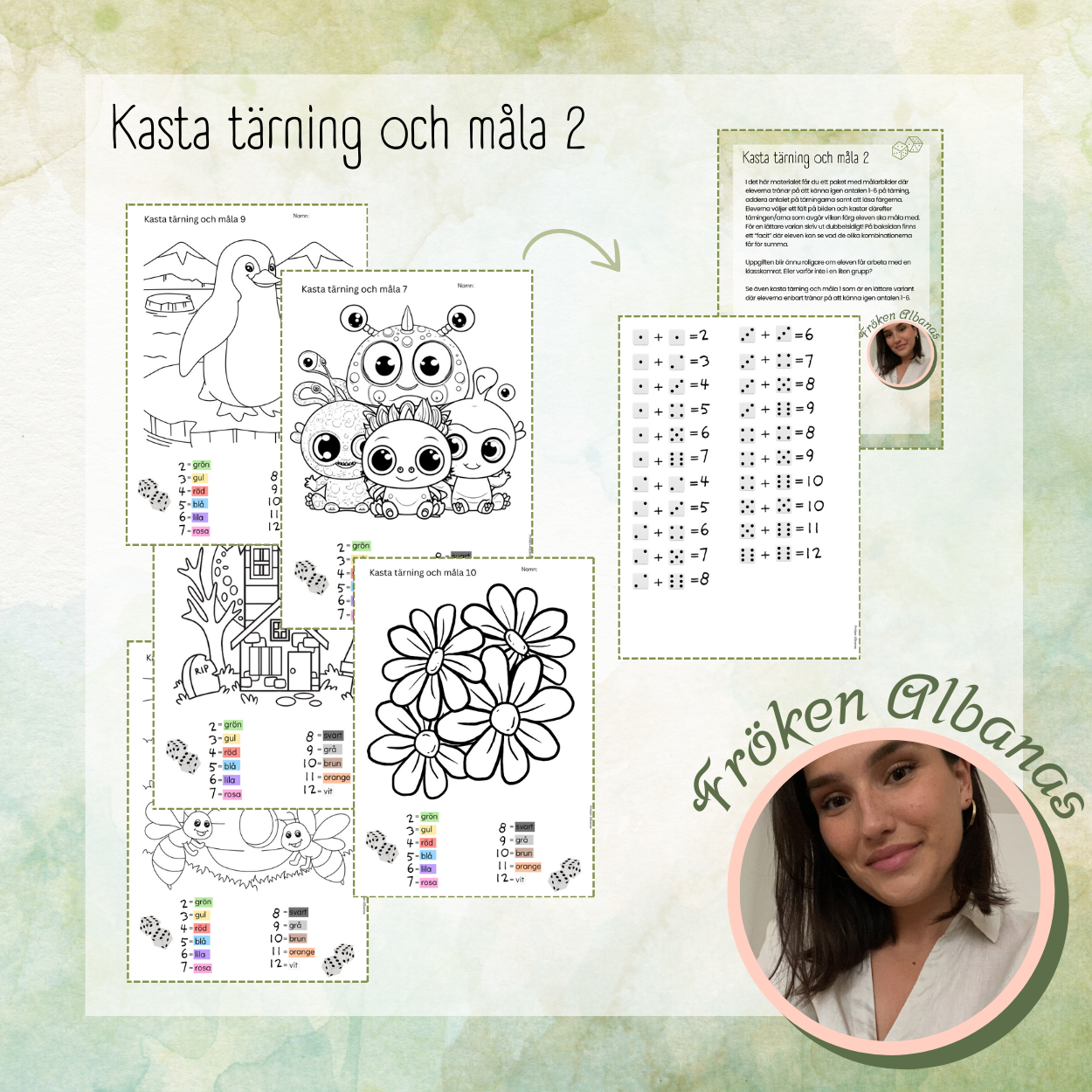 I det här materialet får du ett paket med målarbilder där eleverna tränar på att känna igen antalen 1-6 på tärning, addera antalet på tärningarna samt att läsa färgerna. Eleverna väljer ett fält på bilden och kastar därefter tärningen/arna som avgör vilken färg eleven ska måla med. För en lättare varian skriv ut dubbelsidigt! På baksidan finns ett “facit” där eleven kan se vad de olika kombinationerna får för summa.