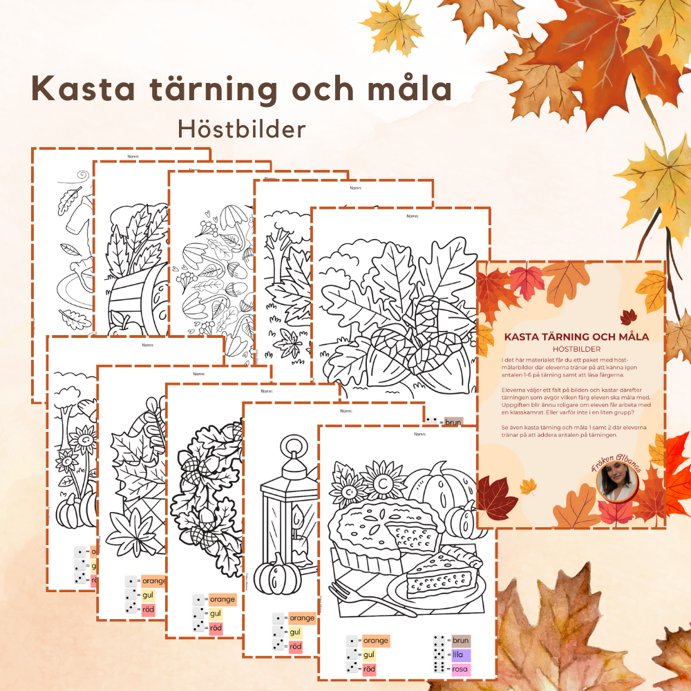 I det här materialet får du ett paket med 10st höst-målarbilder där eleverna tränar på att känna igen antalen 1-6 på tärning samt att läsa färgerna.