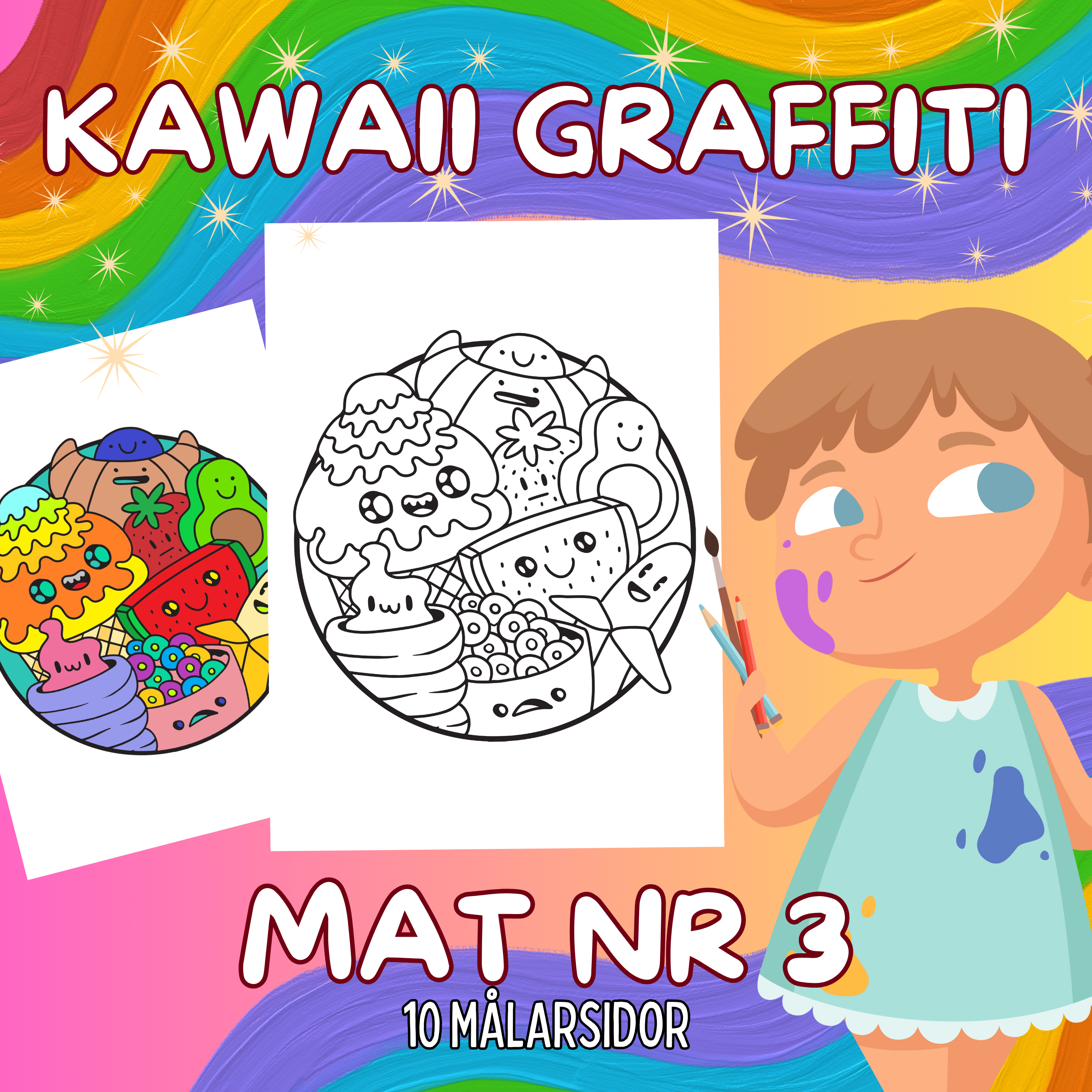 10 målarsidor med söt kawaii mat i graffitistil att måla.