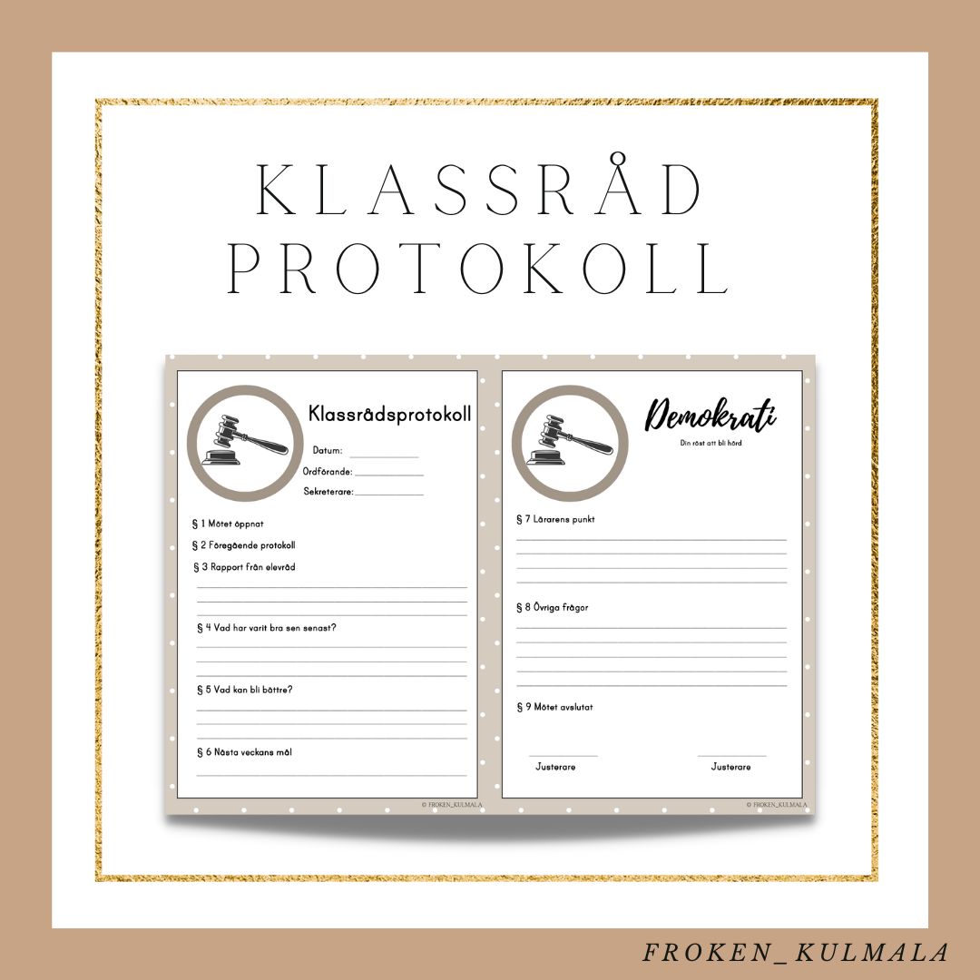 Klassrådsprotokoll med neutrala färger som tränar på begrepp; ordförande, sekreterare och justerar. Inbjuder även till att klassen får samtala, diskutera, reflektera och utvärdera vad som fungerar i klassrummet/skolan och vad som behöver utvecklas.