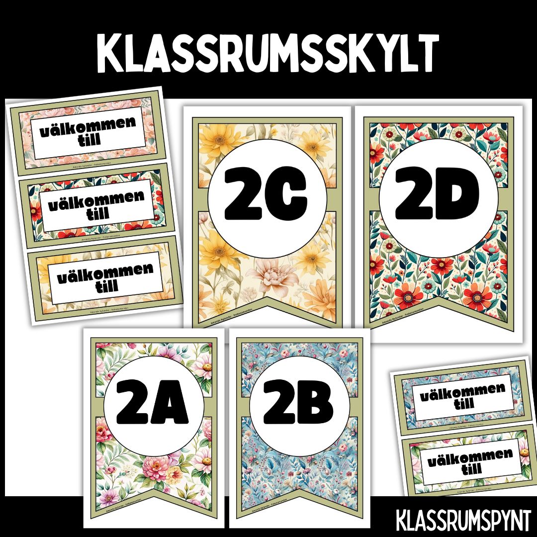 Pynta klassrumsdörren med dessa blommiga klassrumsskyltar. Paketet innehåller klassrumsskyltar med fem olika mönster till åk 1 samt en tillhörande ”välkommen till” skylt.
