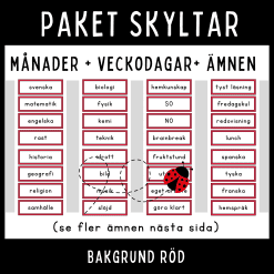 I paketet ingår skyltar för alla månader, alla veckodagar och vanliga skolämnen.