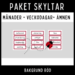 Klassrumsskyltar med röd bakgrund – månader, veckodagar & skolämnen
