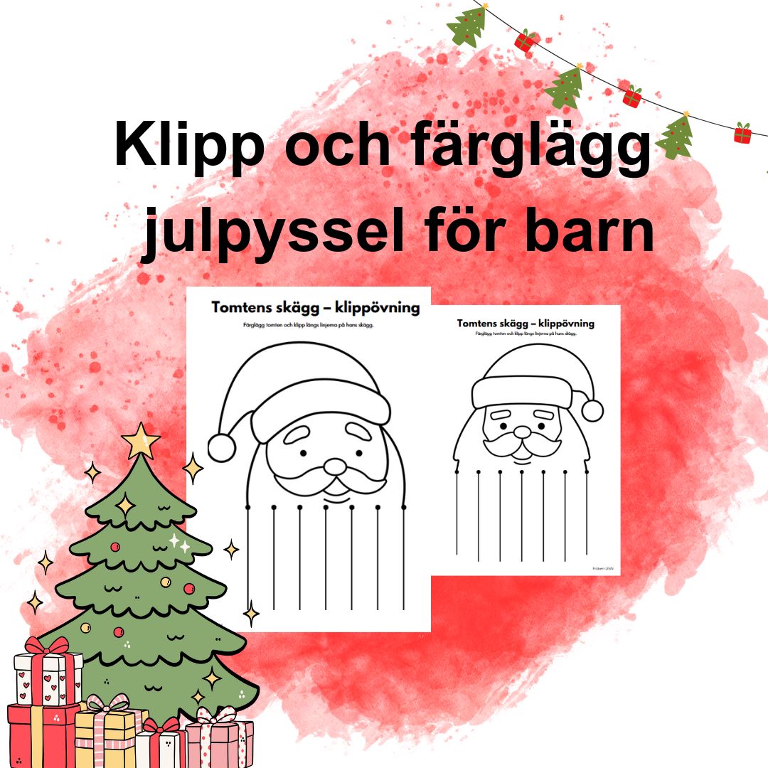 En rolig julaktivitet där barnen först färglägger tomten och sedan tränar sin finmotorik genom att klippa längs linjerna på hans långa skägg. Perfekt för förskola och förskoleklass för att öva klippteknik, koncentration och kreativitet på ett lekfullt sätt.