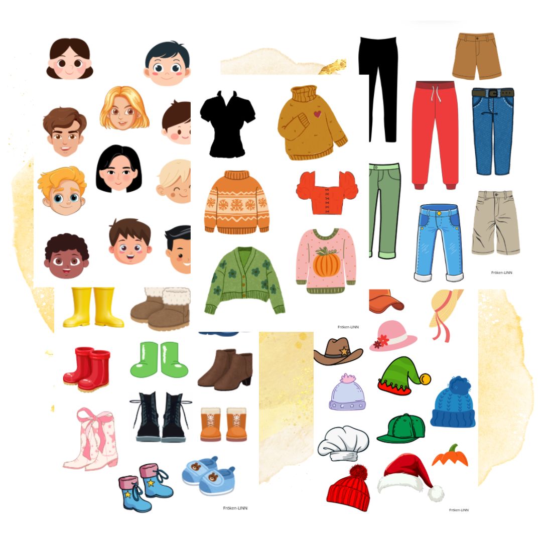 Ett roligt pysselmaterial med 28 sidor där barnen kan klippa och klistra ansikten, kläder, skor, väskor och hattar i rätt storlek. De kan även rita egna händer och fötter för att skapa sin unika figur. Perfekt för att träna finmotorik, fantasi och kreativitet på ett lekfullt sätt!