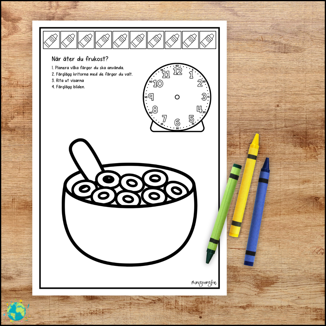 ⏰ Skriv om din dag – En skrivövning där barnen övar på att beskriva sin dag med klockslag.