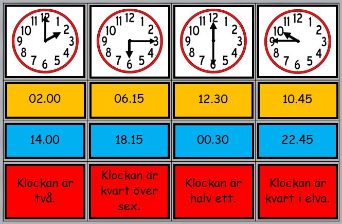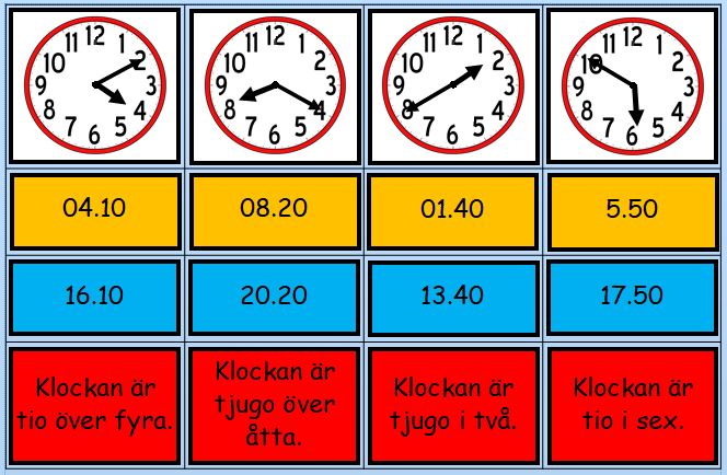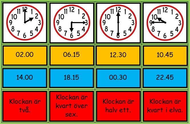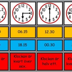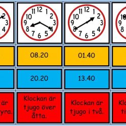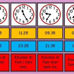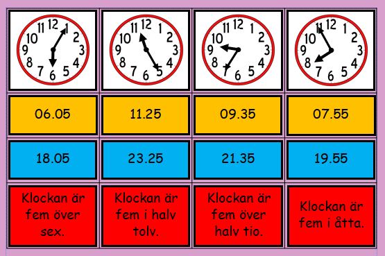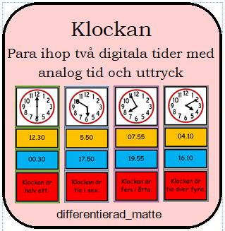 Para ihop de två digitala tiderna med den analoga klockan och det analoga uttrycket. Korten är färgkoordinerade så att övningen kan differentieras. Kort med grön rand är hel, halv, kvart i och kvart över. Kort med blå rand har tider med tio i, tio över, tjugo över och tjugo i. Kort med lila rand har tider med fem i, fem över, fem i halv och fem över halv. Dessutom finns en variant med grå rand där alla kort finns. Det gör att det går att differentiera genom att någon arbetar med gröna kort, någon annan med blå och lika kort samt en tredje med de grå korten.