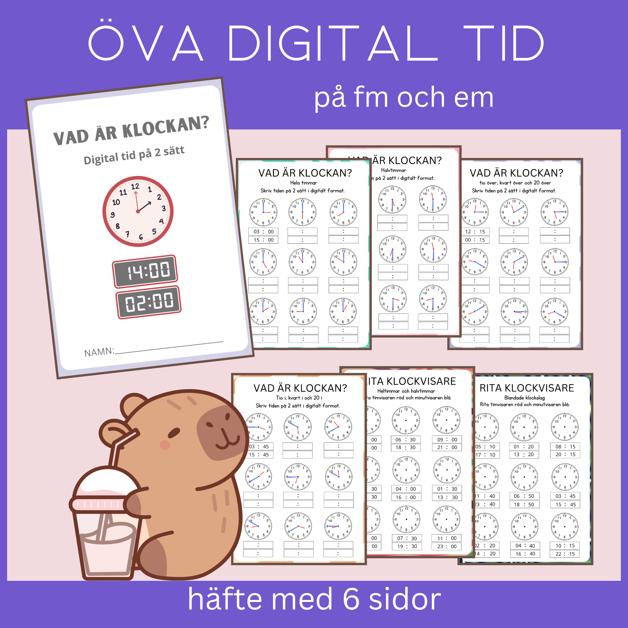 Klockan – skriv digital tid, häfte med 6 arbetsblad