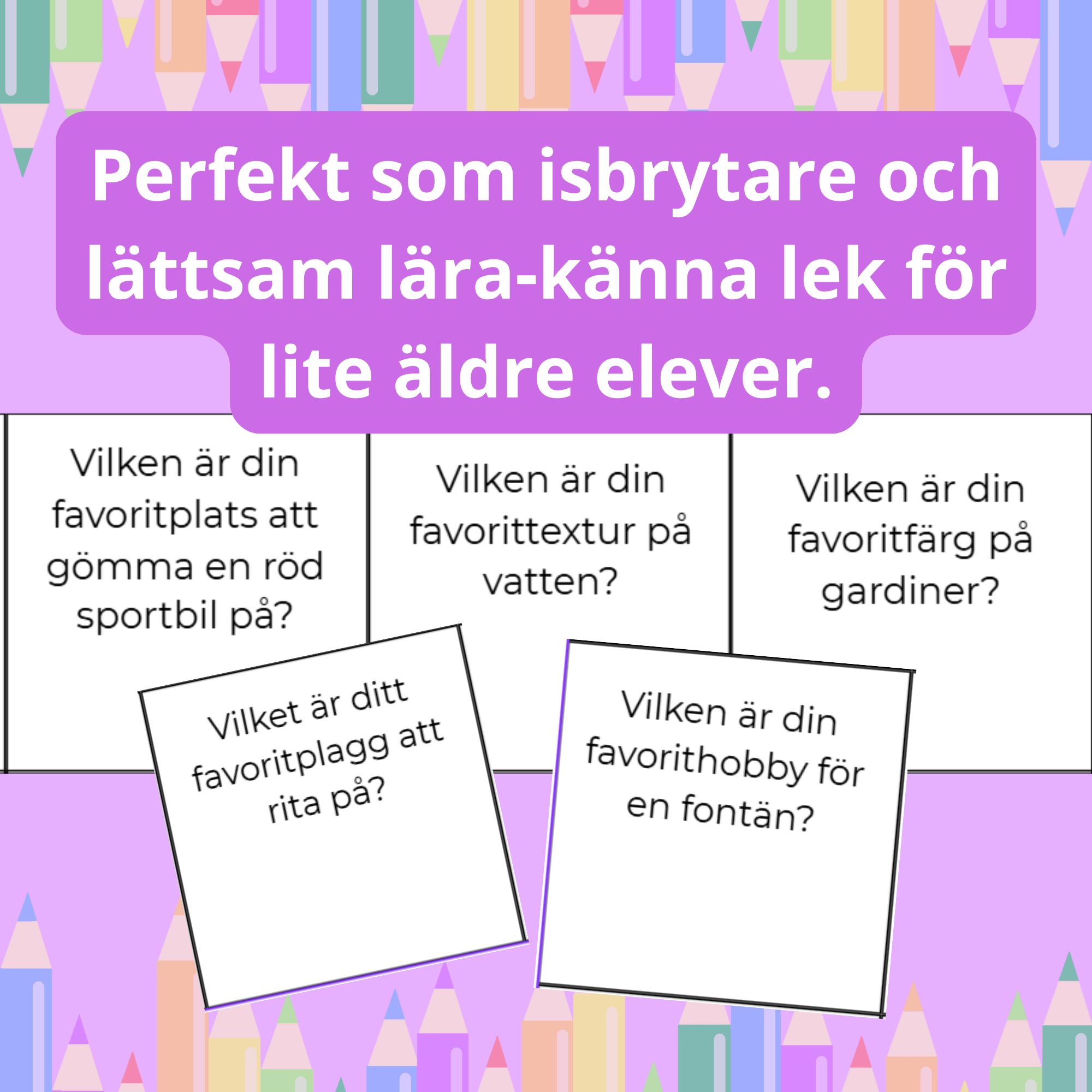 3 bingobrickor med frågor som mjukstartar interaktion och gemenskap inför läsåret med vad jag hoppas är mycket skratt och roliga svar! Eleverna får verkligen låta sin fantasi flöda! Perfekt om man vill ha ett lite mer “opersonligt” sätt att få eleverna att prata med varandra, då det inte är någon förankring i verkligheten utan alla svar kan vara totalt påhitt <3