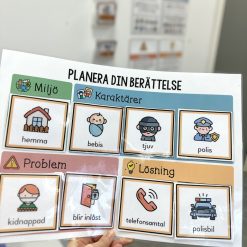 - Tre olika varianter av A3-underlägg för planering av berättelse, som man kan laminera. Tanken är att eleverna kan fästa utvalda bildkort på underlägget och ta hjälp av dem när de skriver sin berättelse. Själva bildkorten (med bilder på olika karaktärer, miljöer, problem & lösningar) finns i första paketet. Se bilder, det finns även på instagram på kontot froken_sarahs_material