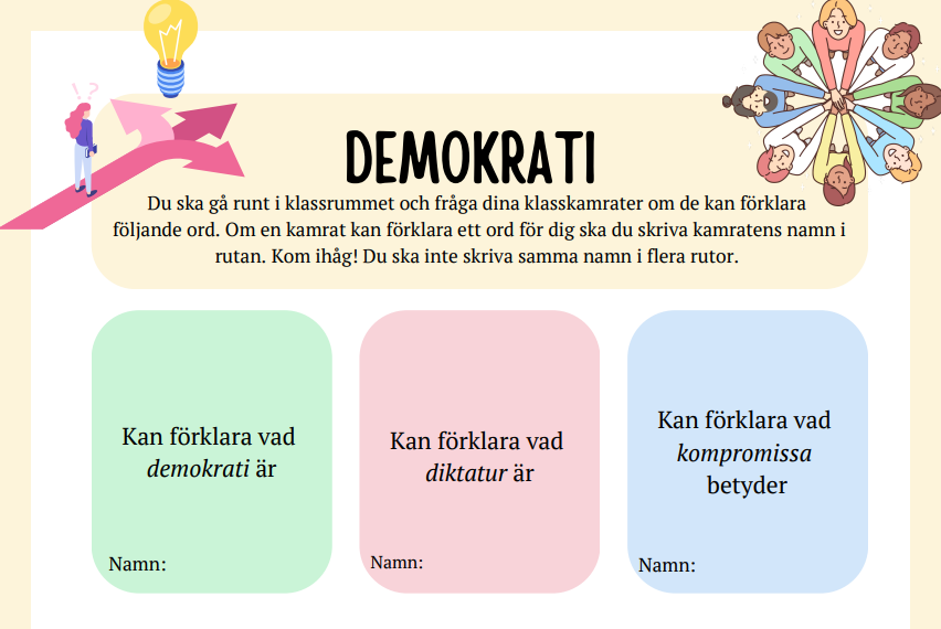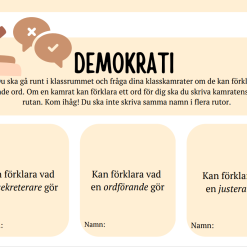 En bra övning att använda både under och efter arbetet med området Demokrati där eleverna får röra på sig samtidigt som de repeterar begrepp. Passar utmärkt att använda när man arbetar med SO Puls böckerna då dessa begrepp framgår i böckerna.