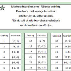 Läs av tabellen och placera ut koordinaterna i systemet. Dra samtidigt streck allteftersom koordinaterna placeras. När alla koordinater är utplacerade framträder en uggla.