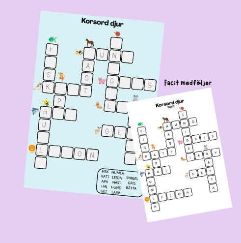 Ett korsord med djur. Det bokstäver som är inskrivna är till för att barnet ska kunna träna på att skriva bokstaven. Det finns även en ruta längt ner på sidan på vilka ord som ska vara med i korsordet, vilket kan vara till hjälp för stavningen och bidra till ett lärande.