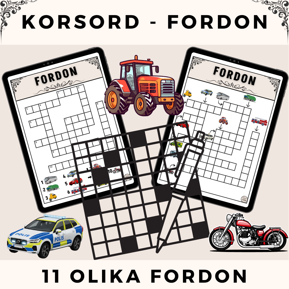 Ett enkelt korsord med 11 typer av vanliga fordon i samhället där en bild på fordonet utgör ledtråden. Kommer i flera olika varianter där du antingen kan välja att ha alla ledtrådar samlat längst ned på bladet eller utspritt där ordet ska skrivas. Du kan även välja om du vill ha en version där listan med alla fordon finns med för att göra det lite enklare.