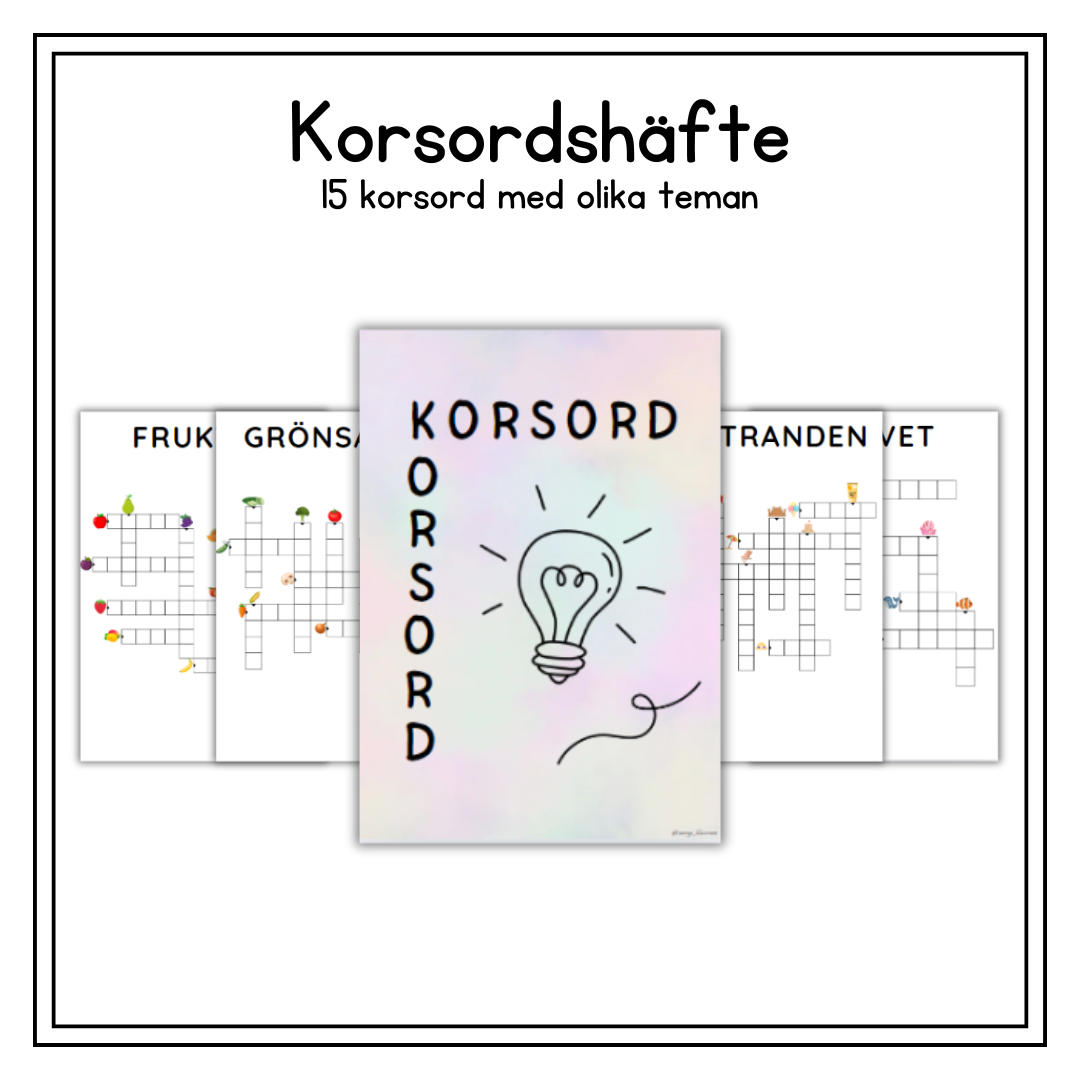 Häfte med 15 korsord med olika teman, exempelvis olika högtider, stranden, havet, skogen med mera. Kan användas som helt häfte eller enskilda arbetsblad.