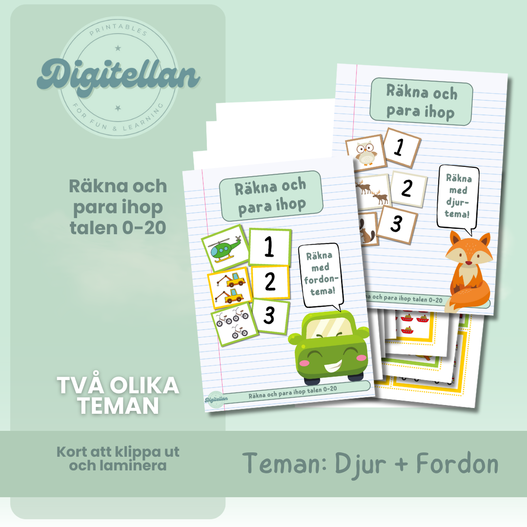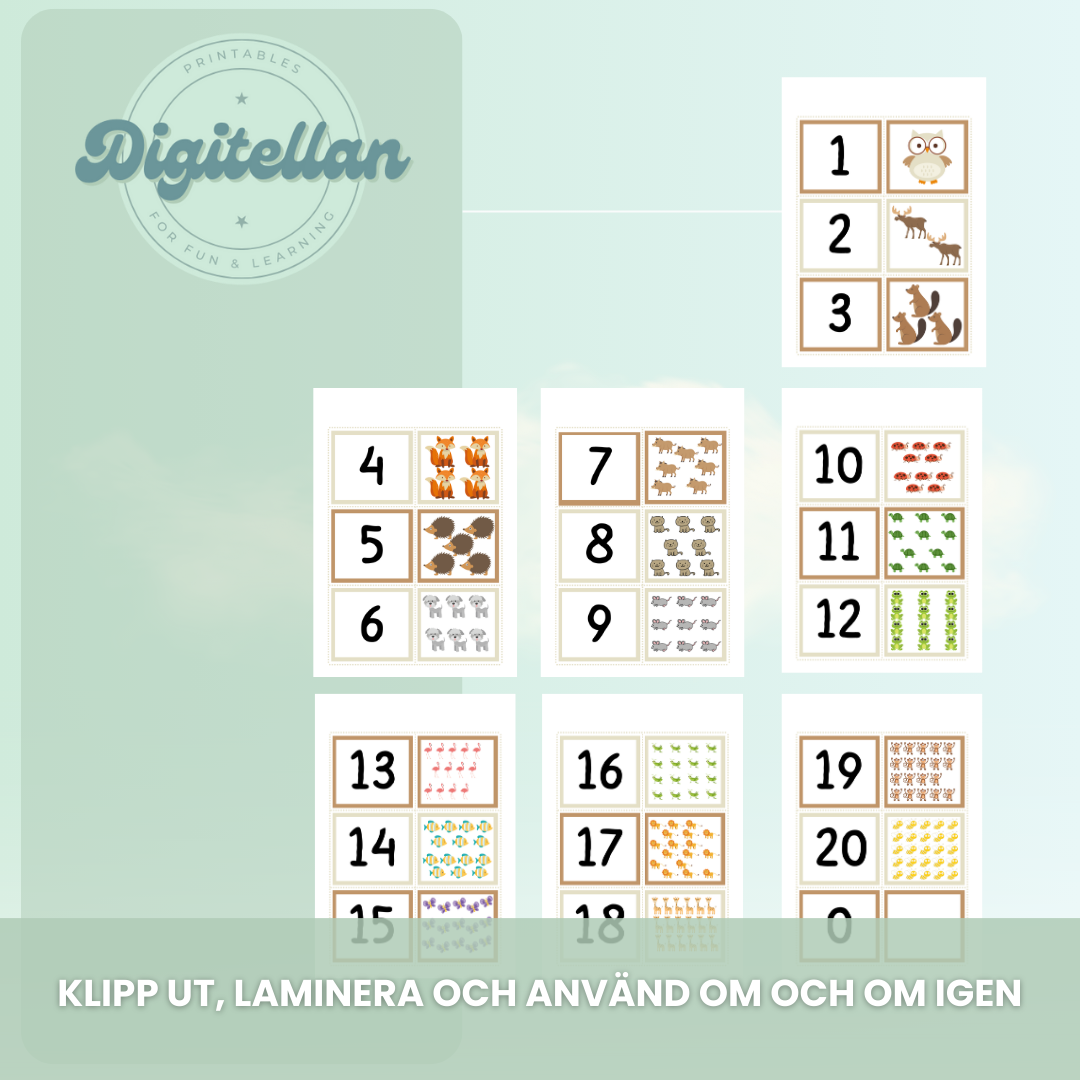 Kort att klippa ut och laminera. Para ihop rätt antal med rätt tal 0-20. Perfekt material på lektioner med olika stationer.