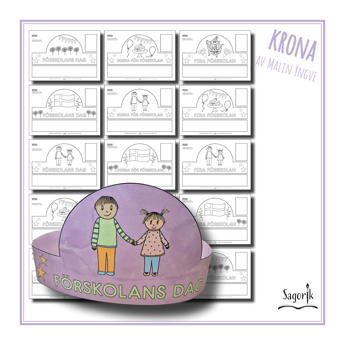 Krona Förskolans dag har tre olika texter och fem olika motiv – du får totalt femton olika kronor!