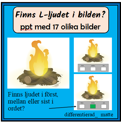 Här får du en powerpoint med 17 bilder där eleverna kan vara med och fundera på om L-ljudet finns i ordet. Finns det inte blir bilden överkryssad. Finns ljudet så funderar man vidare. Är ljudet först, mellan eller sist? Bilden får ett rutsystem under bilden med dessa 3 alternativ. När du sedan klickar fram nästa bild markeras nästa ruta så illustreras detta genom att rätt ruta markeras.
