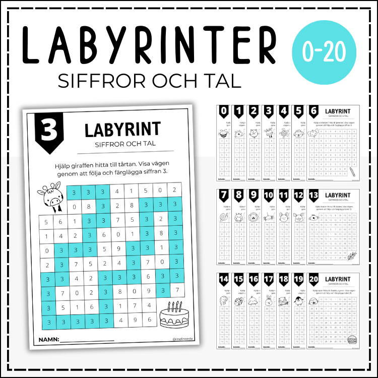 Labyrinter med tal och siffror, 0-20. Hjälp djuret komma fram genom att följa och färglägga det givna talet.