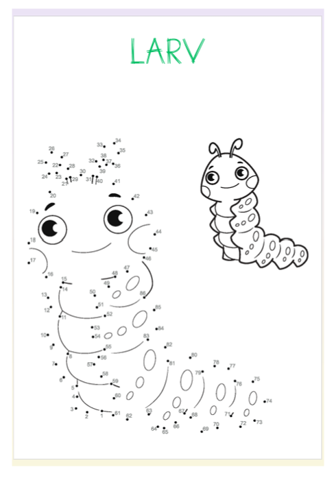66 sidor med prick till prick övningar. Här finns flera olika sorters djur t ex bälta, lama, krokodil, hamster mfl. Här finns också dinosaurier, fordon, frukter och mat.