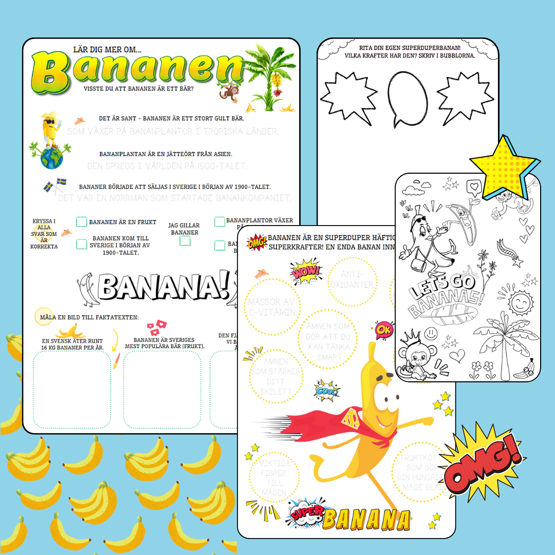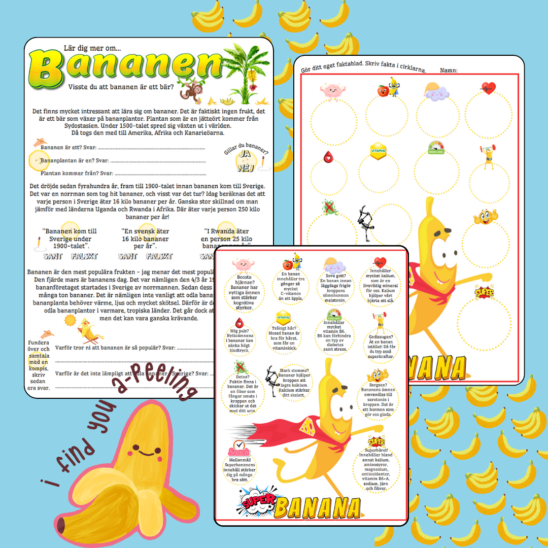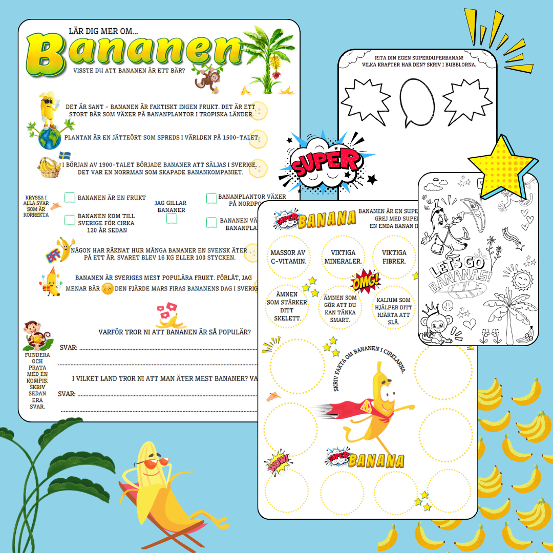 Med mera! Materialet är ej knutet till bananens dag 4/3. Går att använda när man vill inom exempelvis hemkunskap, idrott och hälsa, SO, svenska, kost. Den 4/3 är ju dock ett ypperligt tillfälle att lära sig mer om superduperbananen!